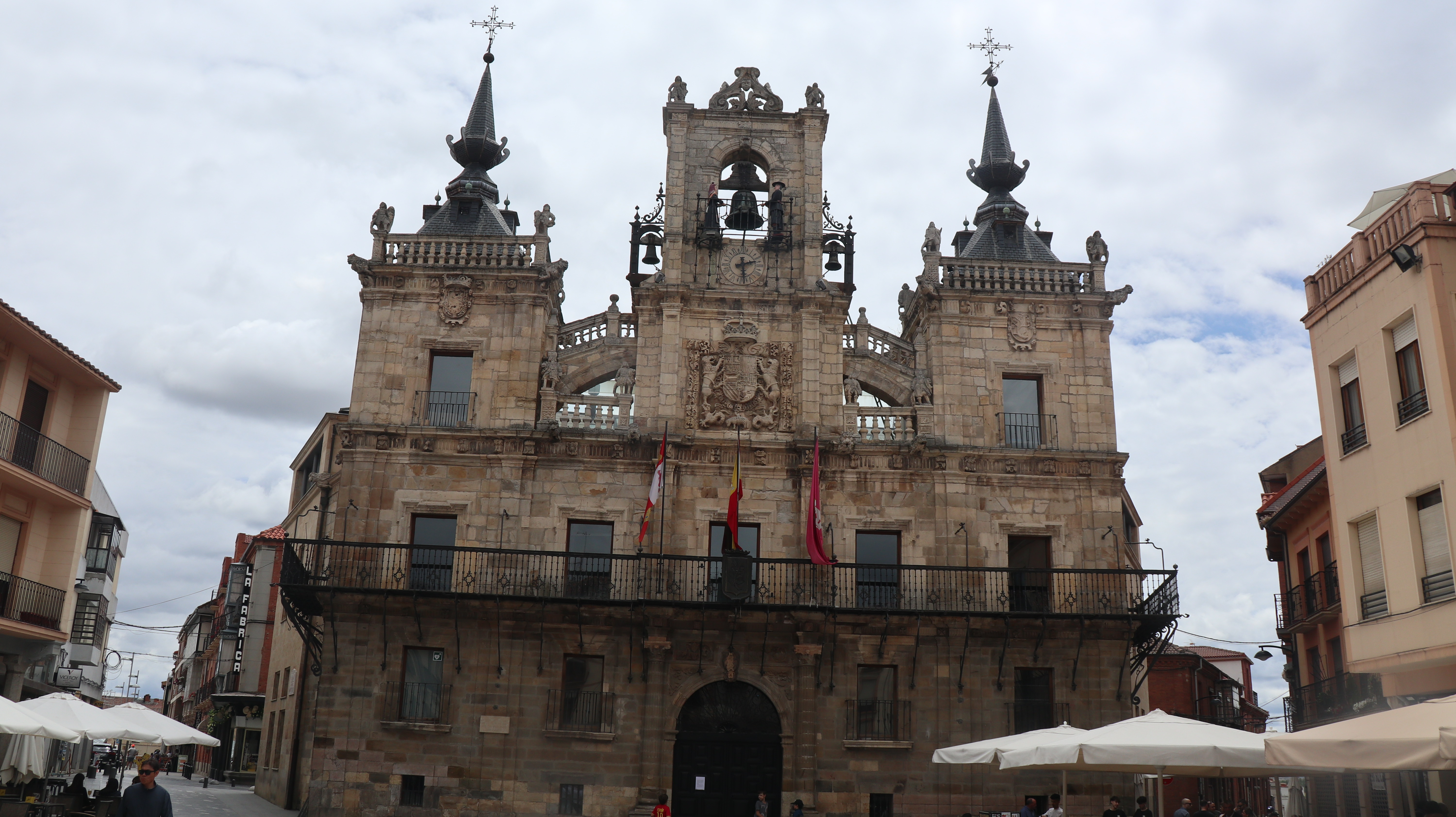 거리를 걸어가니 사람들이 많이 있는 마요르 광장이 있다. 마요르 광장에는 바로크 양식의 아름다운 파사드, 클라비호 전투의 군기가 소장되어 있는 아스토르가 시청(Ayuntamiento)과 쌍둥이 탑, 도시의 상징인 시계탑이 눈에 띈다. 시계에는 독특한 복식을 입은 두 사람이 망치로 종을 치는 모습이 있다. 이 두 사람은 콜로사와 후안 산쿠다라는 두 인물로, 이 시계는 정시는 알려주지만 15분, 30분, 45분은 알려주지 않는다. 그 이유는 이 시계를 만든 장인이 인색한 도시 주민들을 비웃으며 ‘시간은 알려주지만 15분은 알려주지 않겠다.’라고 결심했기 때문이라고 한다.