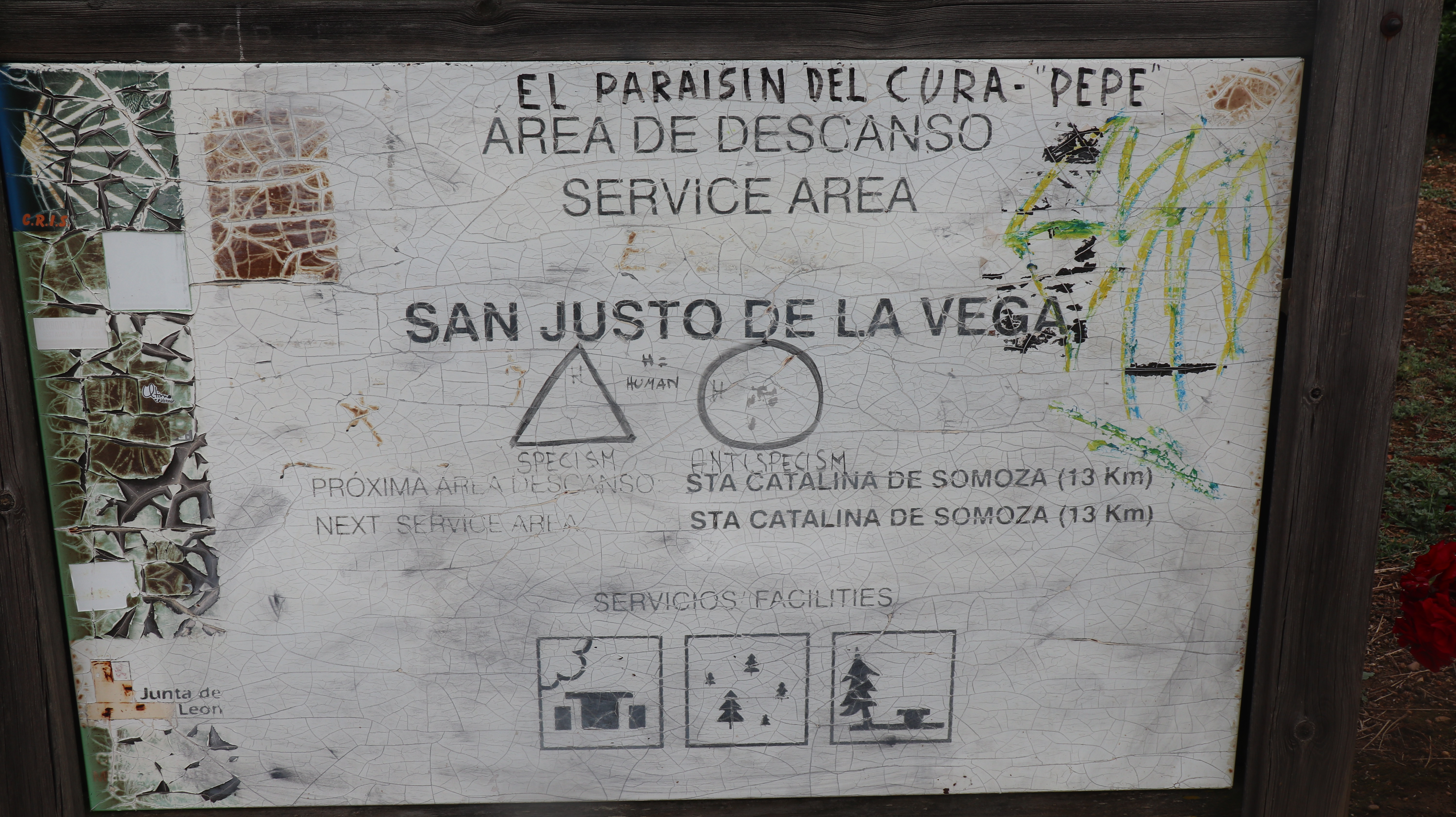 마을의 출구에서 길은 양쪽으로 갈라지는데 재미있게 길을 구분해 놓았다. 직진하는 길에는 우는 얼굴에 road(도로 따라 가는 길)라 표시되었고, 오른쪽 길은 웃는 얼굴로 way로 표시하여 마을길임을 알리고 있다. 레알 까미노를 걷기 위해 오른쪽으로 이어지는 길을 선택해야 한다. 구 시가지와 소박한 들을 지나는 아름다운 길로 이어지는 중간에 오른쪽으로 산 펠리스 데 오르비고로 이어지는 길을 지나치면 비야레스 데 오르비고에 이르기까지 북서쪽으로 길이 이어진다.