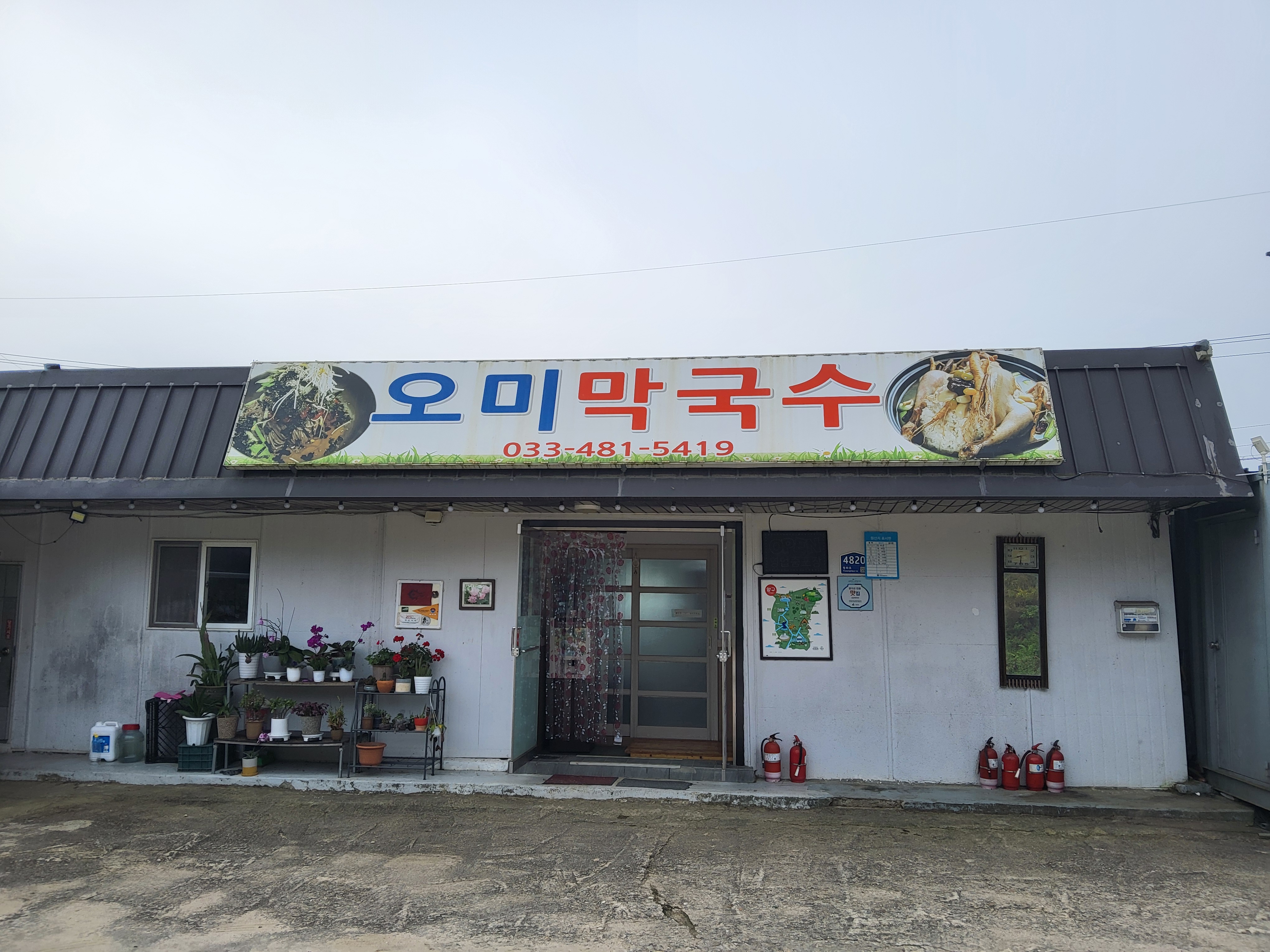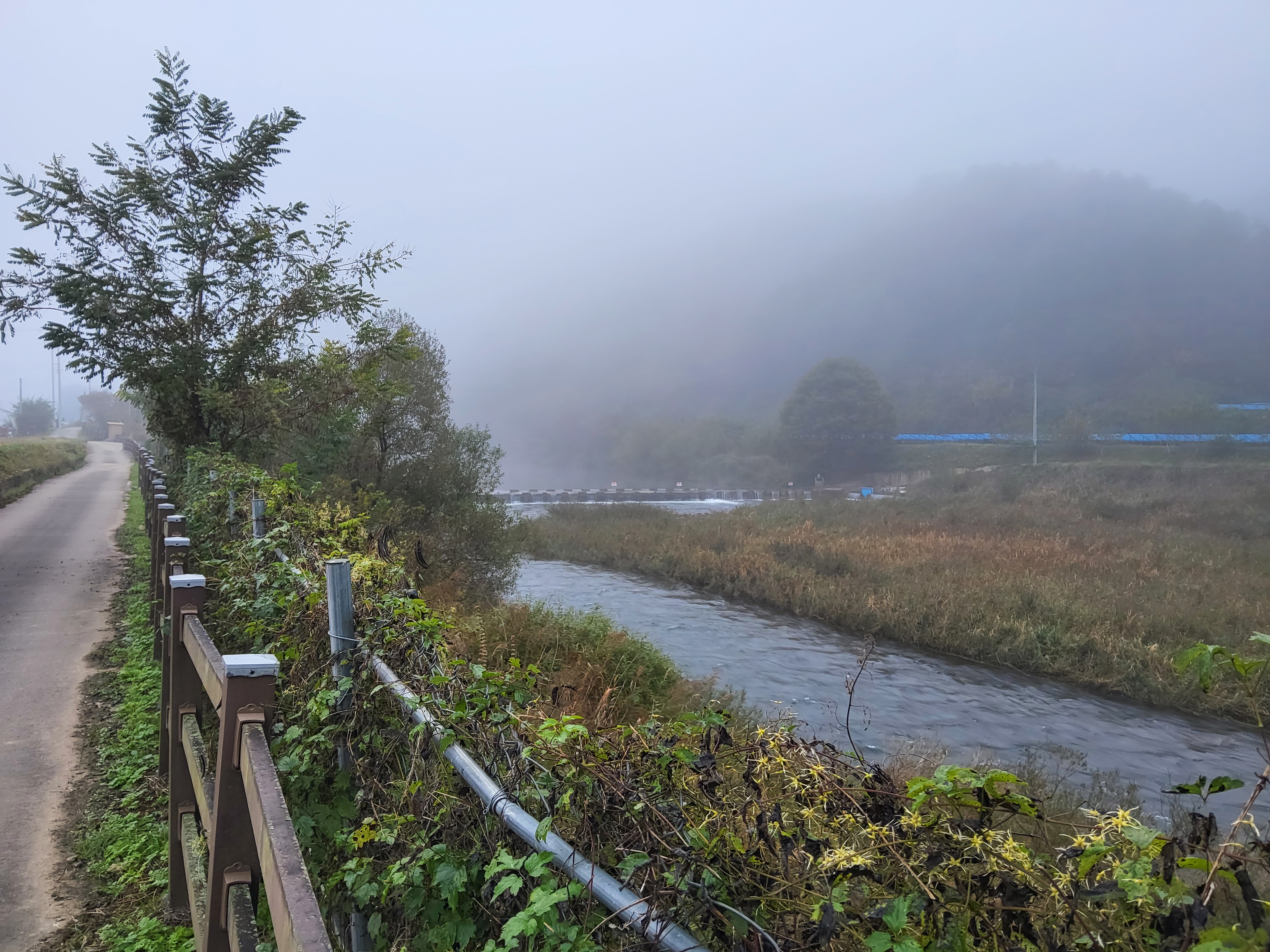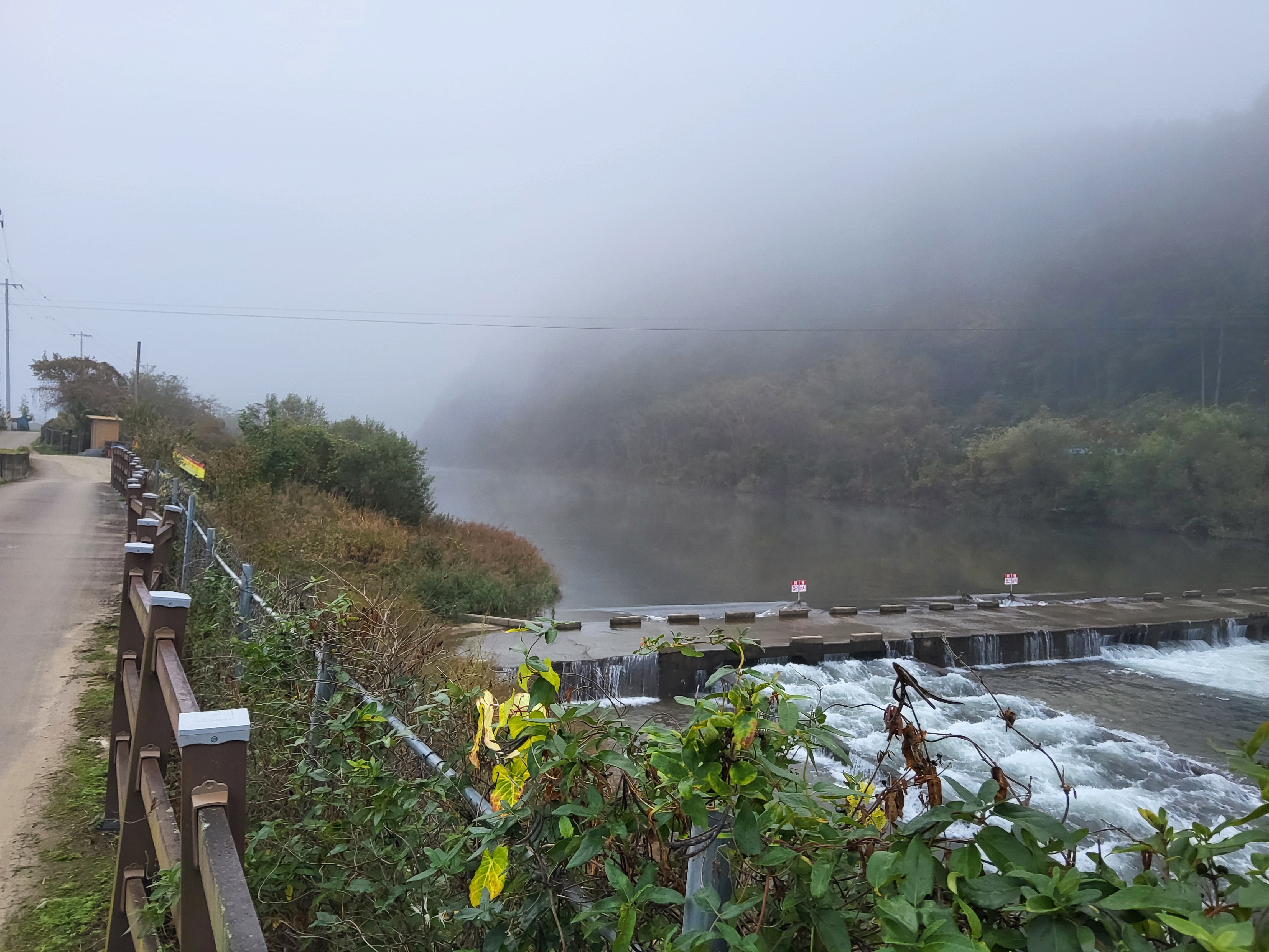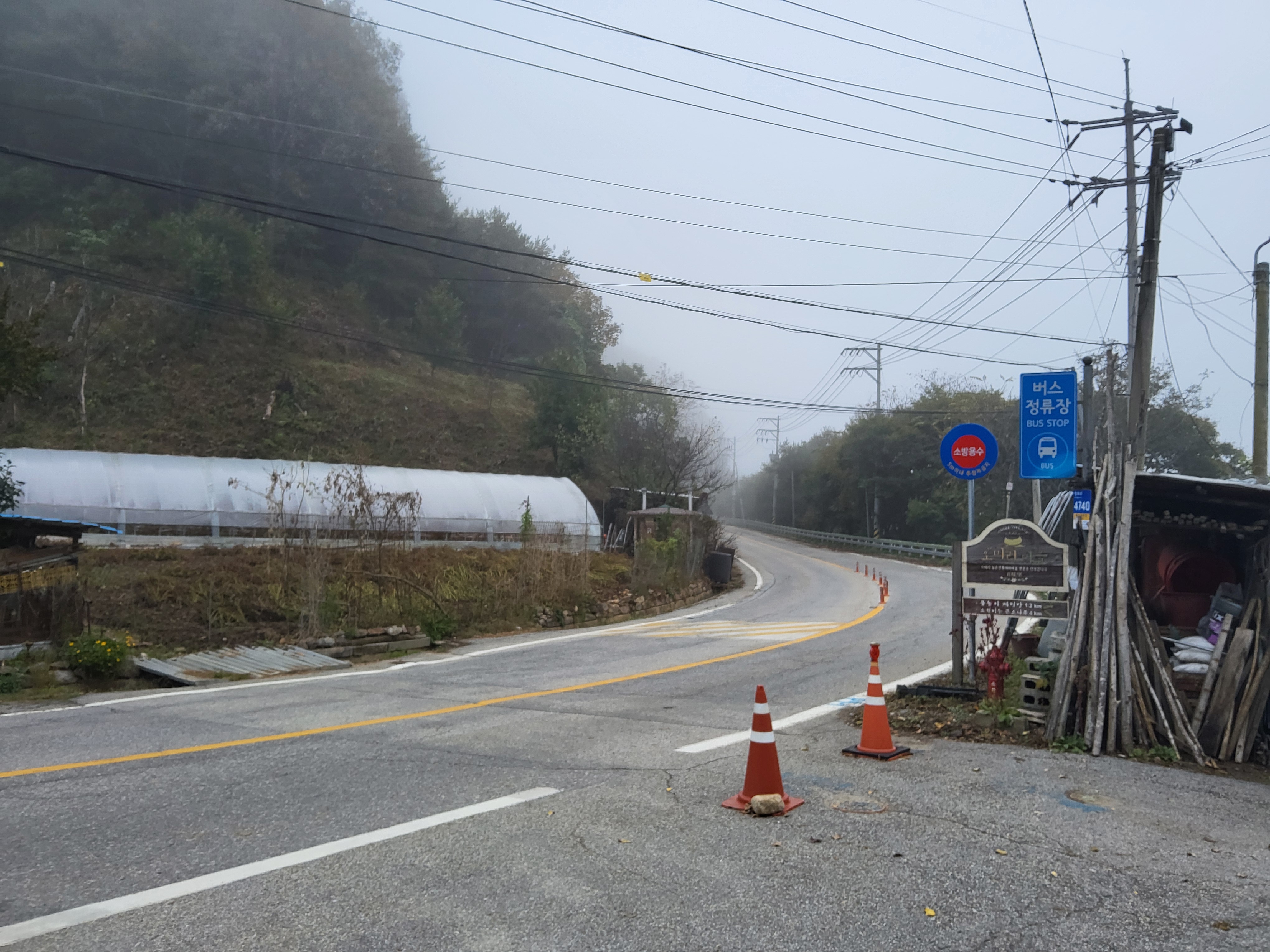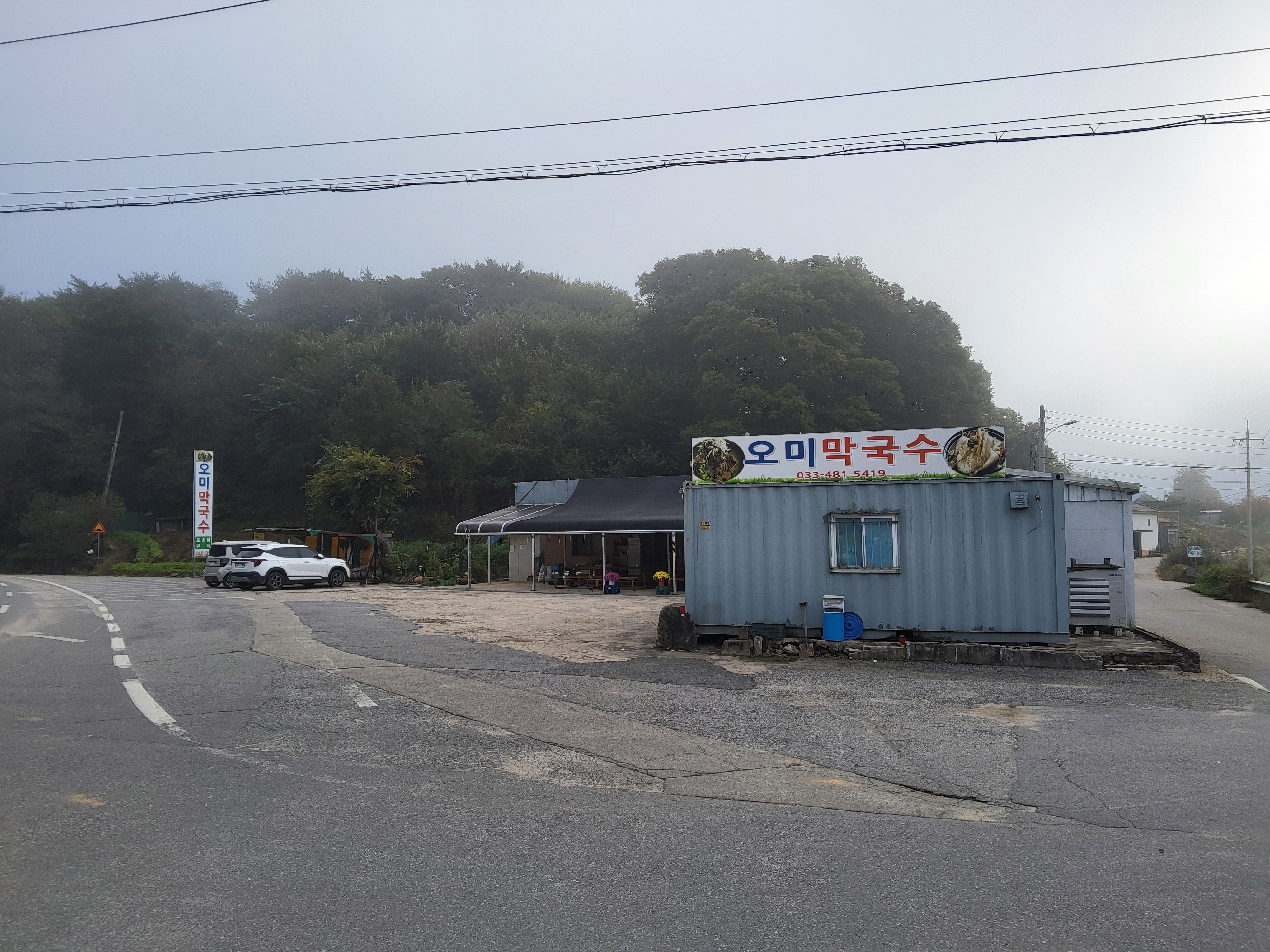 아침 안개가 제법 피여서 몽환적인 분위기를 풍기는 길을 따라가니 수입천을 건너야 길을 가게 되어 있는데 하천을 건널 수가 없었다. 다리가 놓여 있는 것이 아니라 콘크리트로 하천을 막은 작은 통로를 건너야 하는데 수량이 많아 건널 수가 없었다. 두루누비 앱에서는 수량이 많으면 우회하라고 되어 있는데 수량이 많은 여름철도 아니고 늦가을 초겨울에 가까운 시기에 이렇게 수량이 많으리라고 생각할 수가 없었다. 어쩔 수 없이 왔던 길을 다시 돌아가 오미리 농촌체험마을 쪽으로 길을 갈 수밖에 없어 어제 저녁밥을 먹었던 '오미막국수' 앞을 지나갔다.