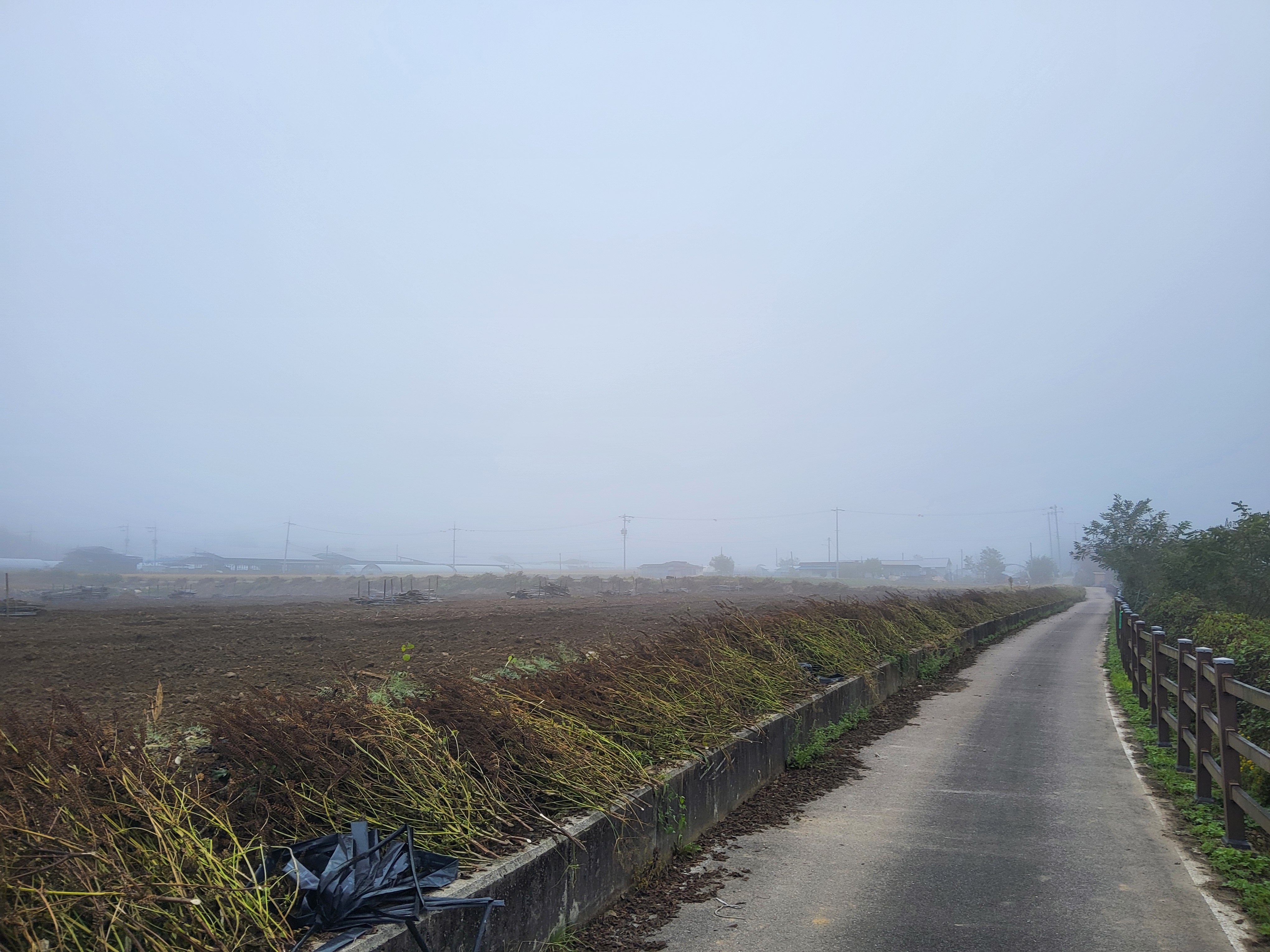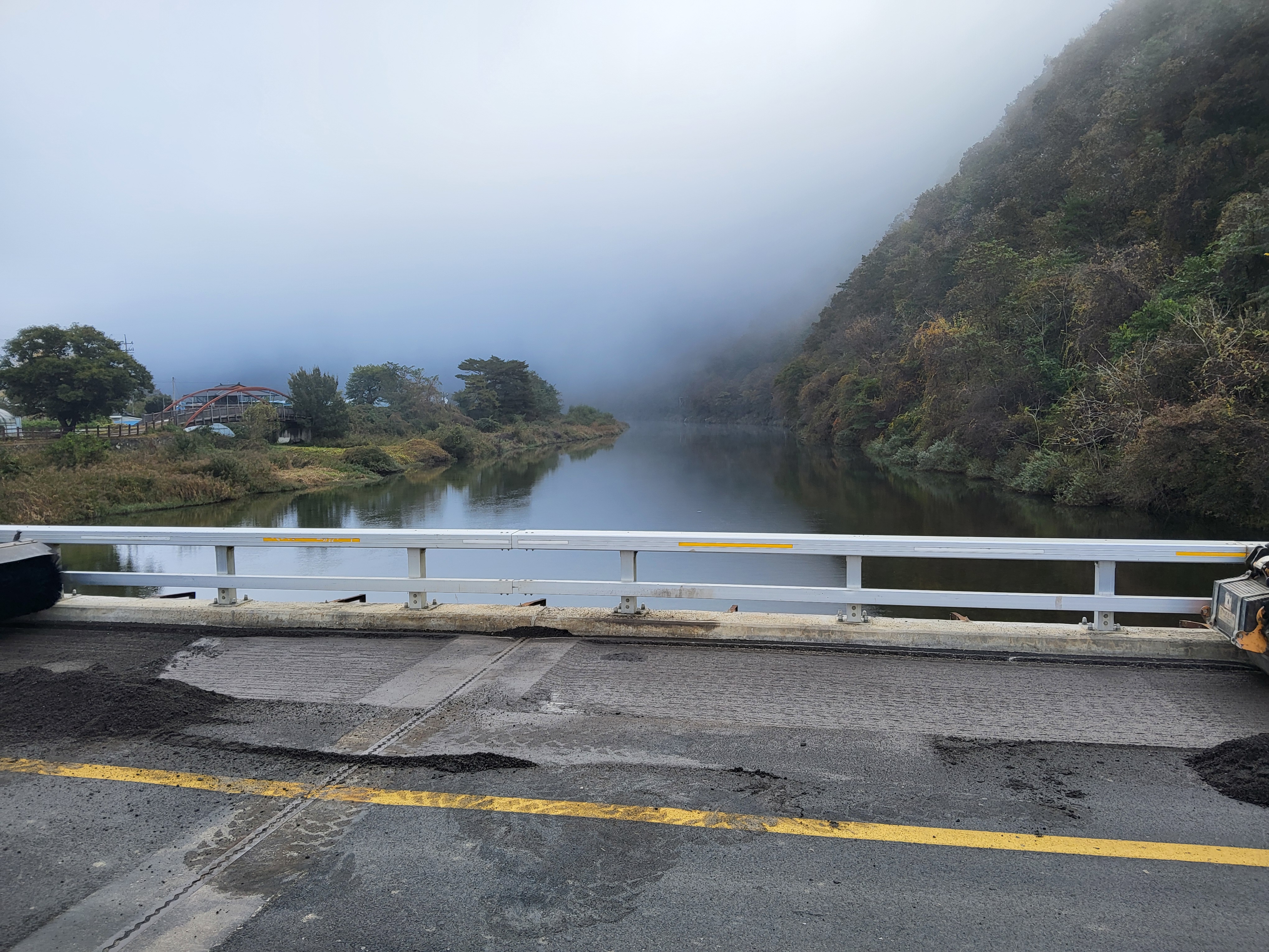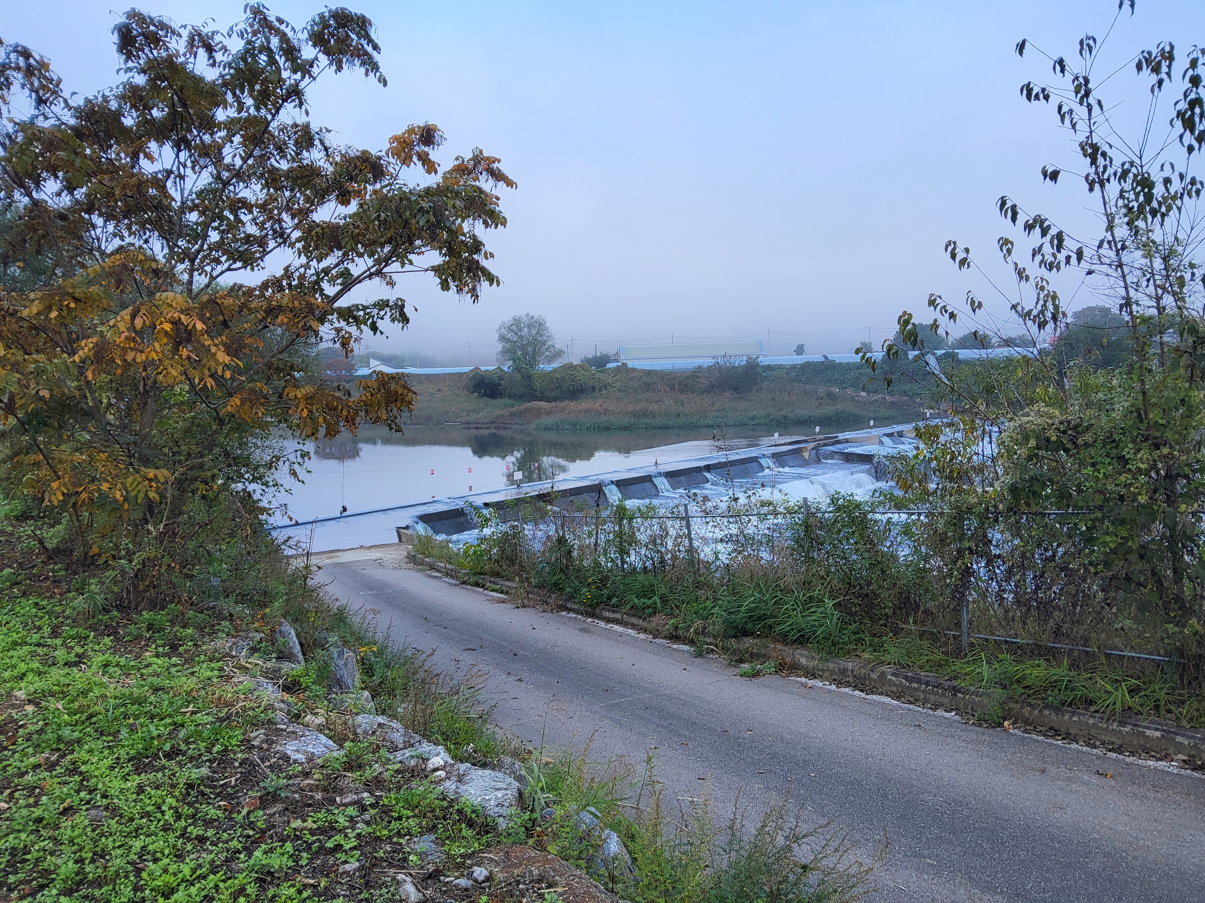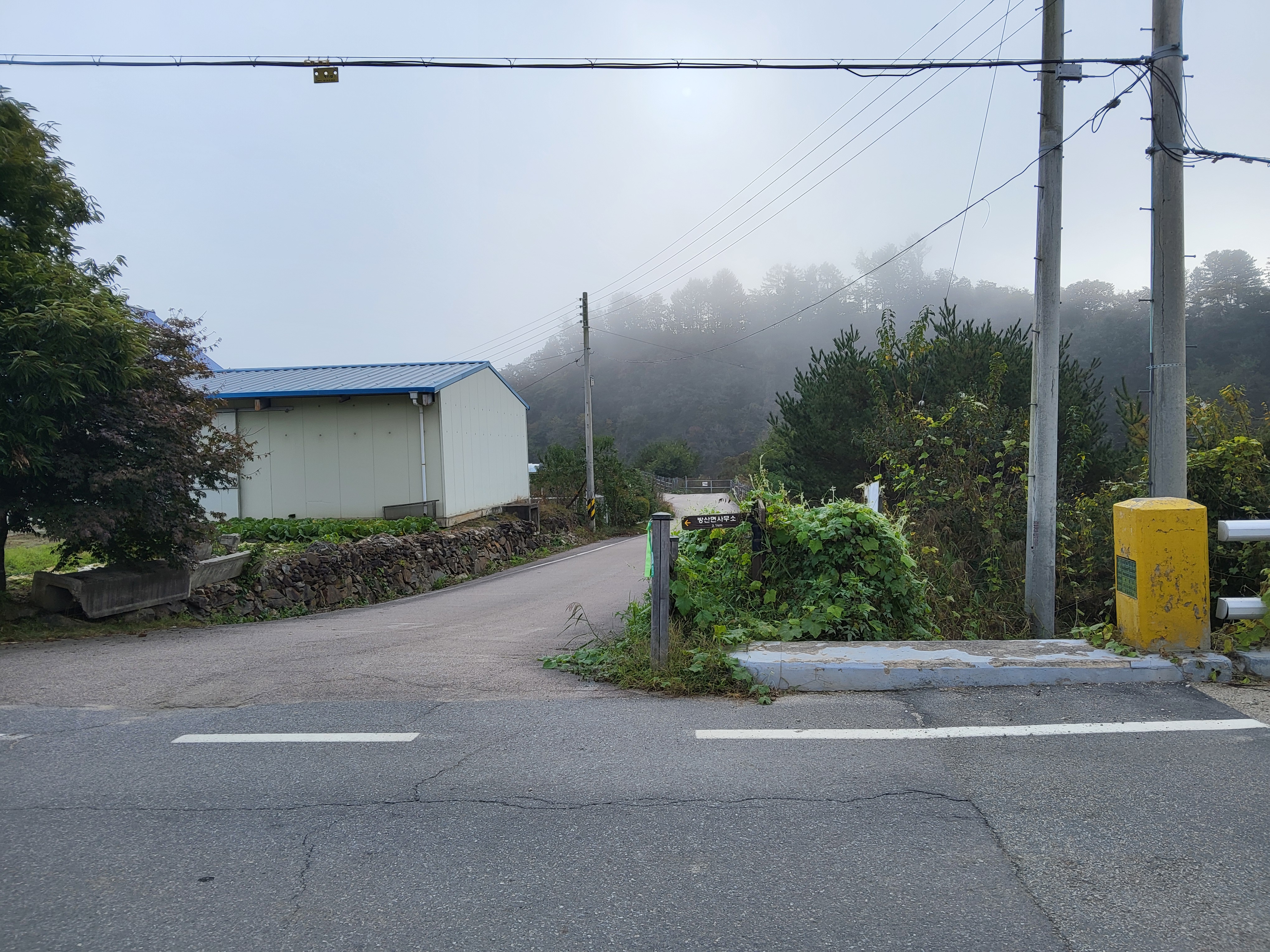 아침 안개가 제법 피여서 몽환적인 분위기를 풍기는 길을 따라가니 수입천을 건너야 길을 가게 되어 있는데 하천을 건널 수가 없었다. 다리가 놓여 있는 것이 아니라 콘크리트로 하천을 막은 작은 통로를 건너야 하는데 수량이 많아 건널 수가 없었다. 두루누비 앱에서는 수량이 많으면 우회하라고 되어 있는데 수량이 많은 여름철도 아니고 늦가을 초겨울에 가까운 시기에 이렇게 수량이 많으리라고 생각할 수가 없었다. 어쩔 수 없이 왔던 길을 다시 돌아가 오미리 농촌체험마을 쪽으로 길을 갈 수밖에 없어 어제 저녁밥을 먹었던 '오미막국수' 앞을 지나갔다.