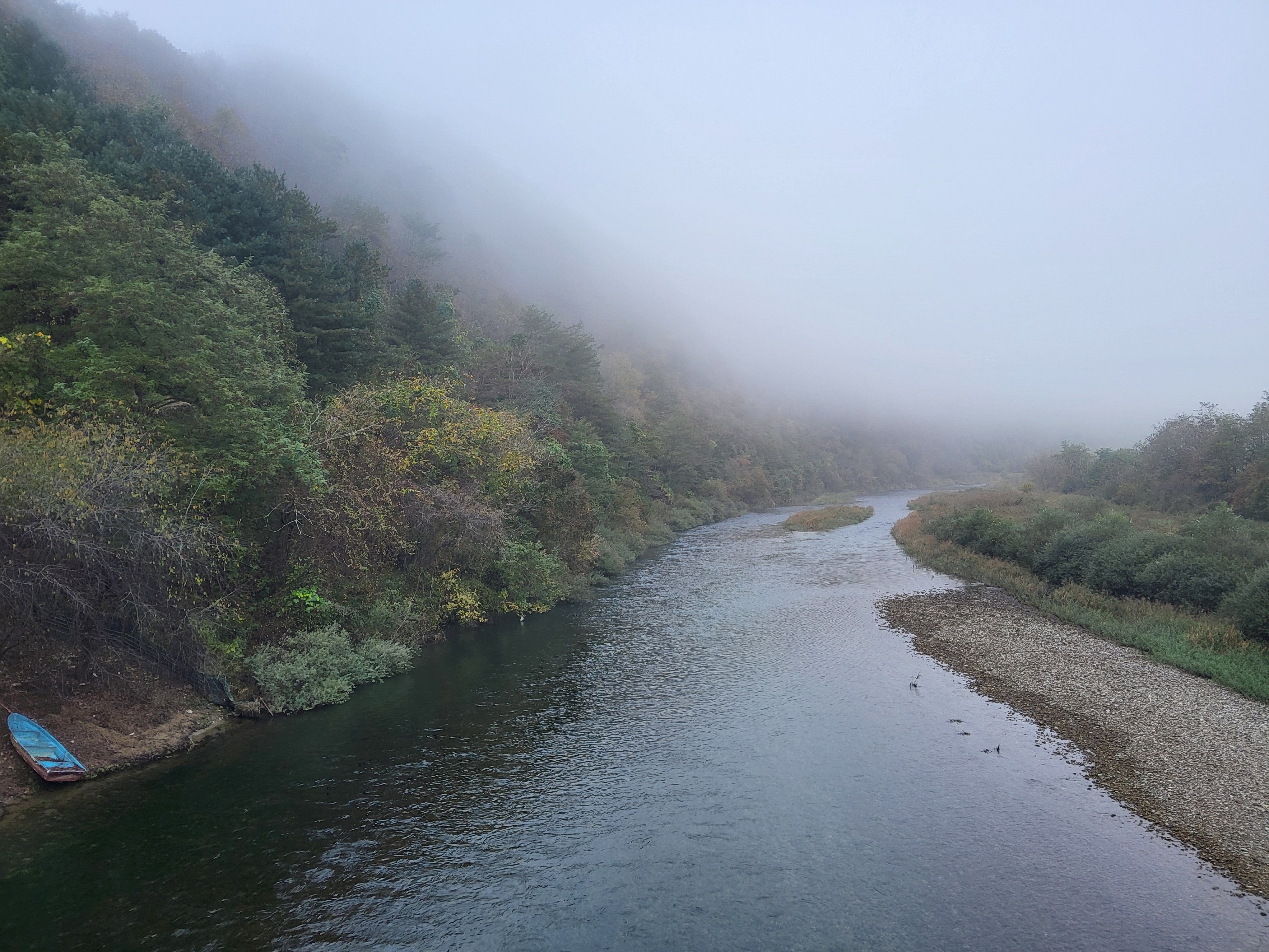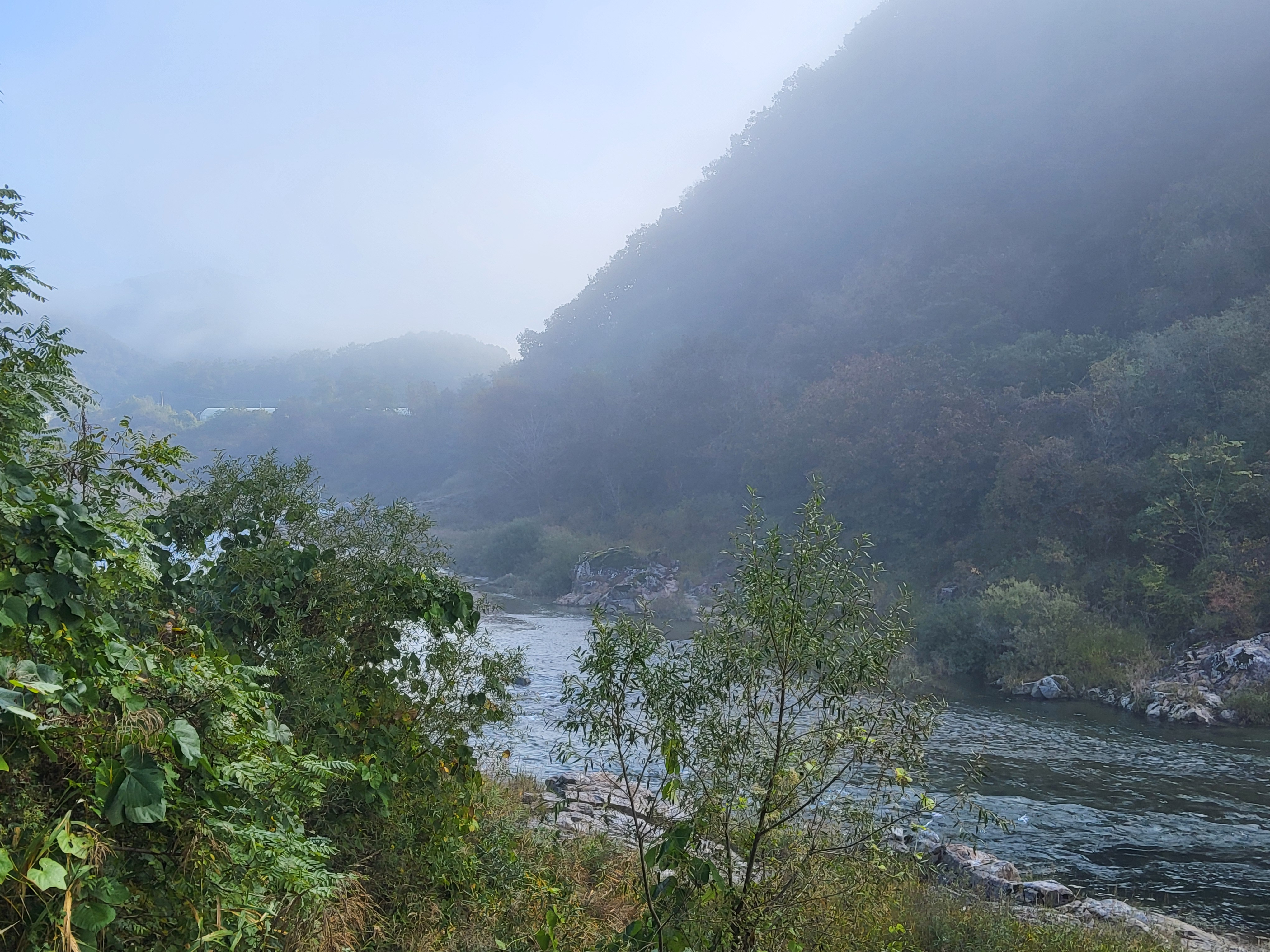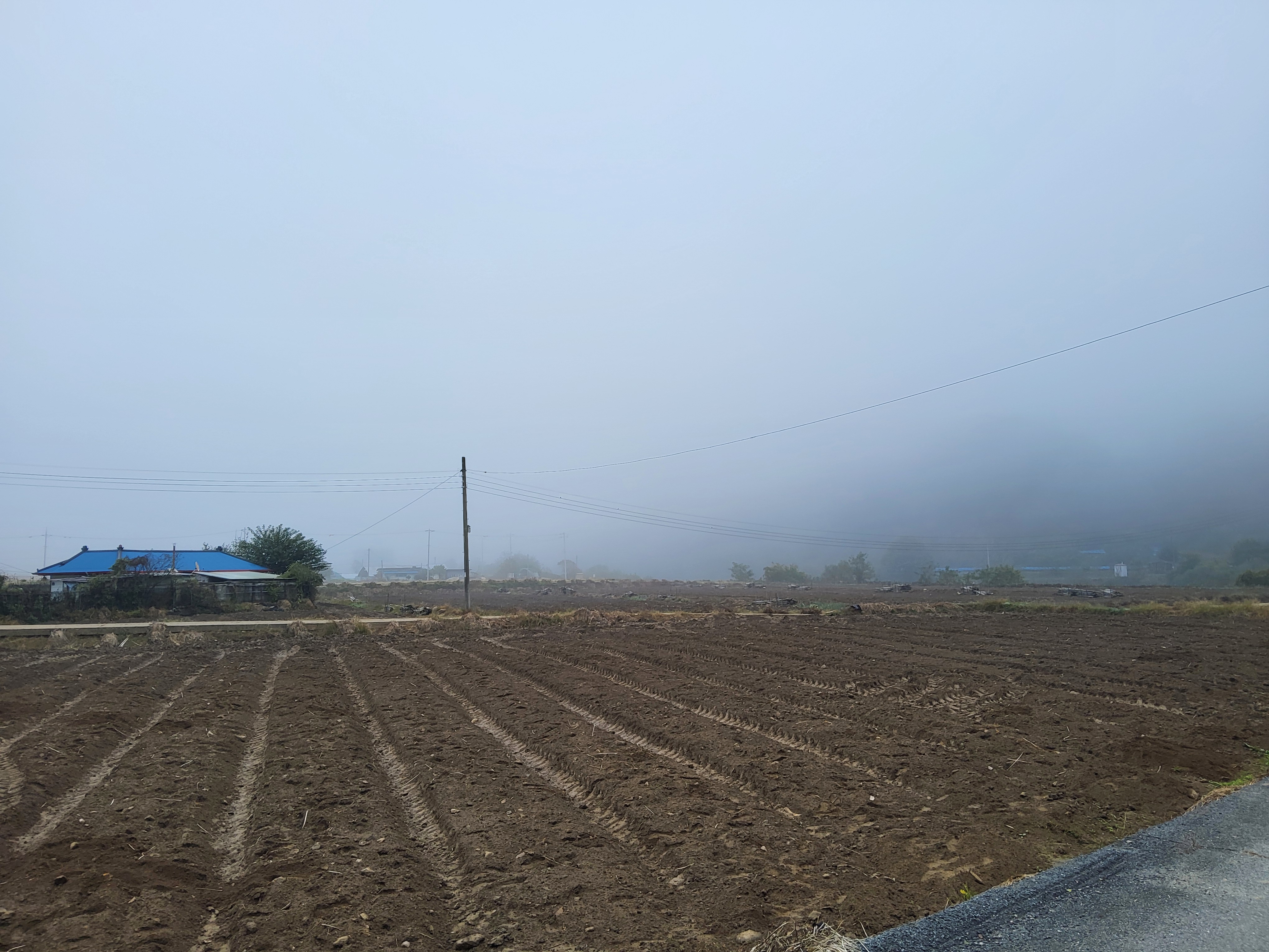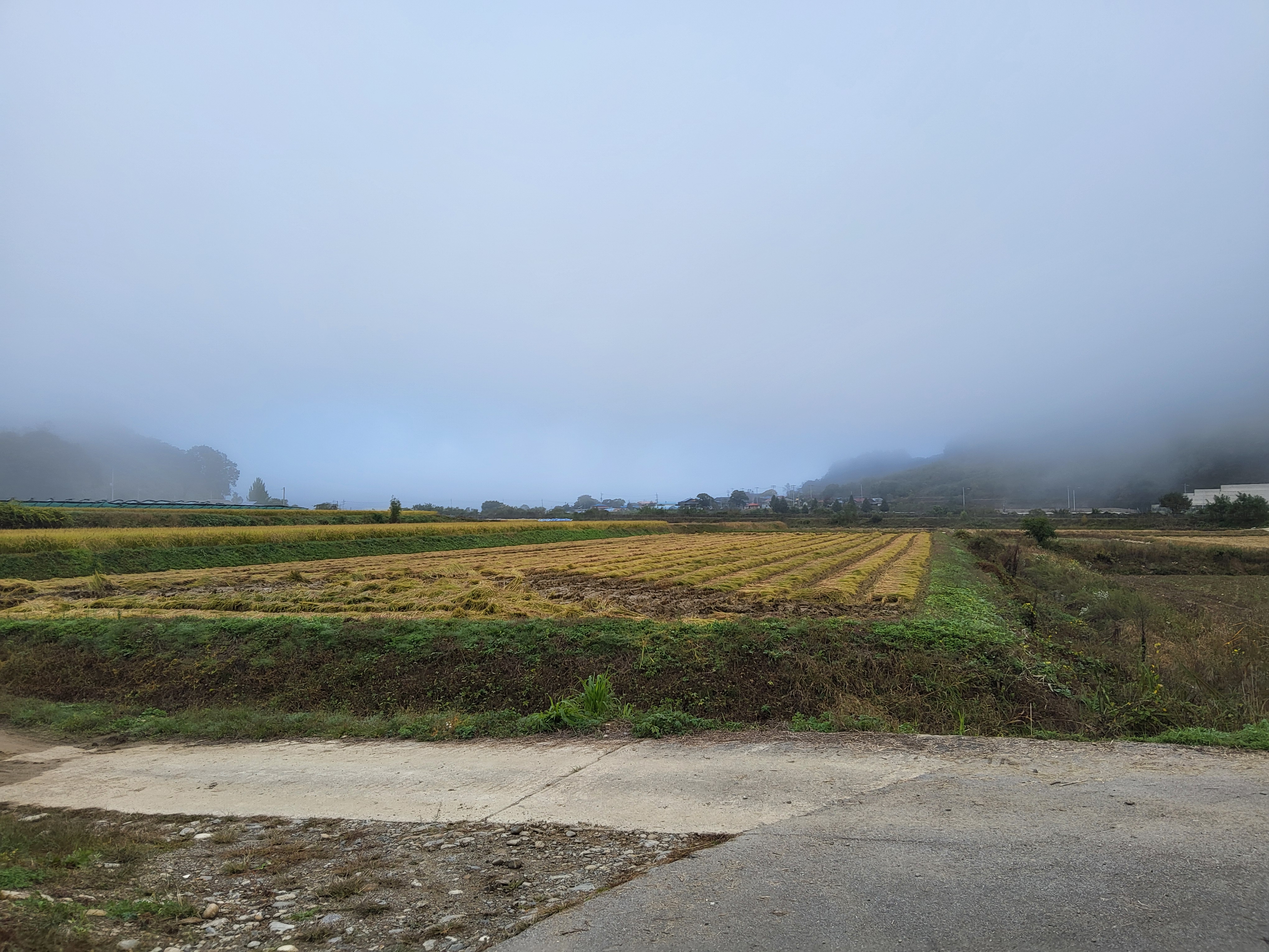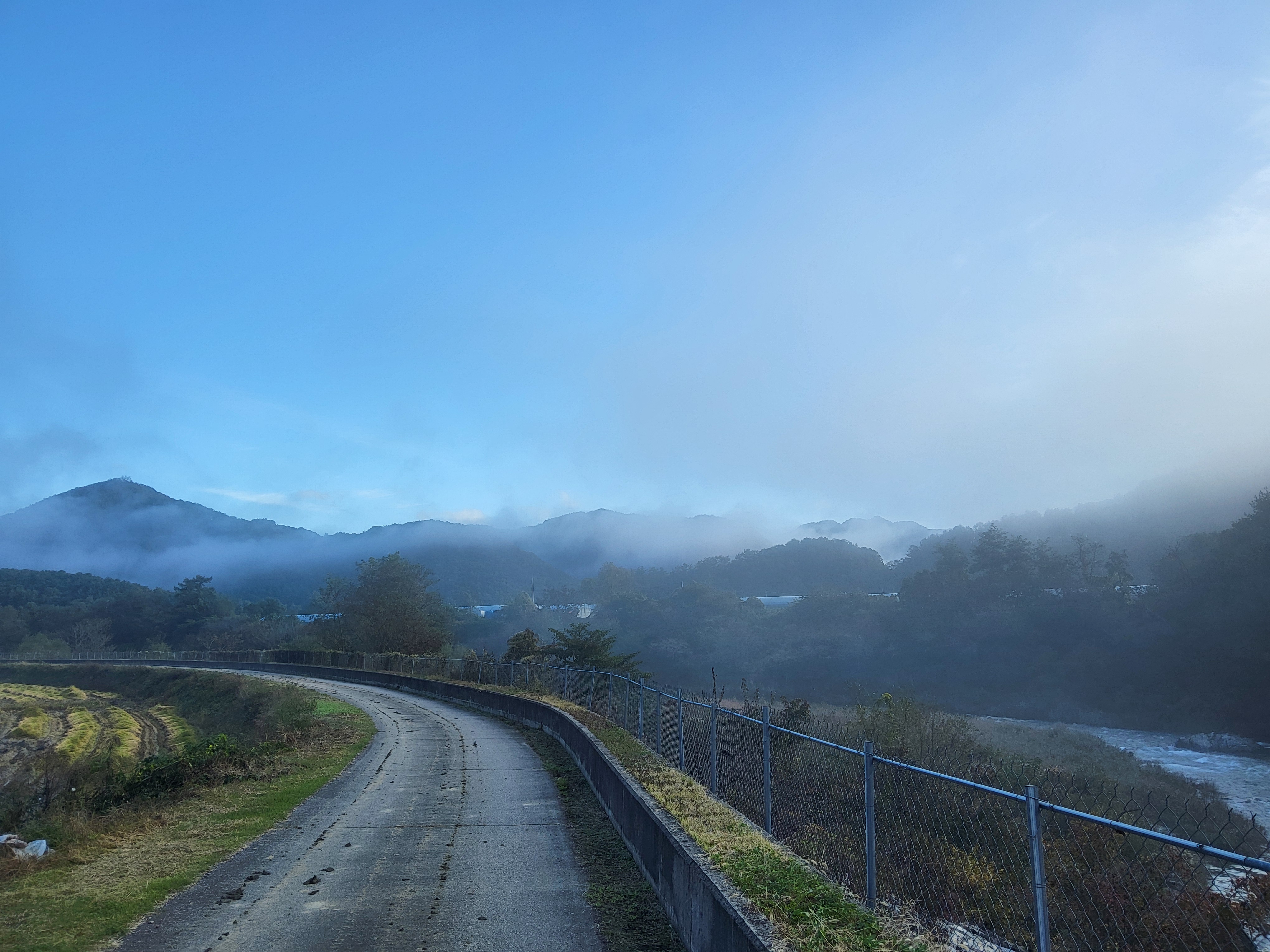 아침 안개가 제법 피여서 몽환적인 분위기를 풍기는 길을 따라가니 수입천을 건너야 길을 가게 되어 있는데 하천을 건널 수가 없었다. 다리가 놓여 있는 것이 아니라 콘크리트로 하천을 막은 작은 통로를 건너야 하는데 수량이 많아 건널 수가 없었다. 두루누비 앱에서는 수량이 많으면 우회하라고 되어 있는데 수량이 많은 여름철도 아니고 늦가을 초겨울에 가까운 시기에 이렇게 수량이 많으리라고 생각할 수가 없었다. 어쩔 수 없이 왔던 길을 다시 돌아가 오미리 농촌체험마을 쪽으로 길을 갈 수밖에 없어 어제 저녁밥을 먹었던 '오미막국수' 앞을 지나갔다.
