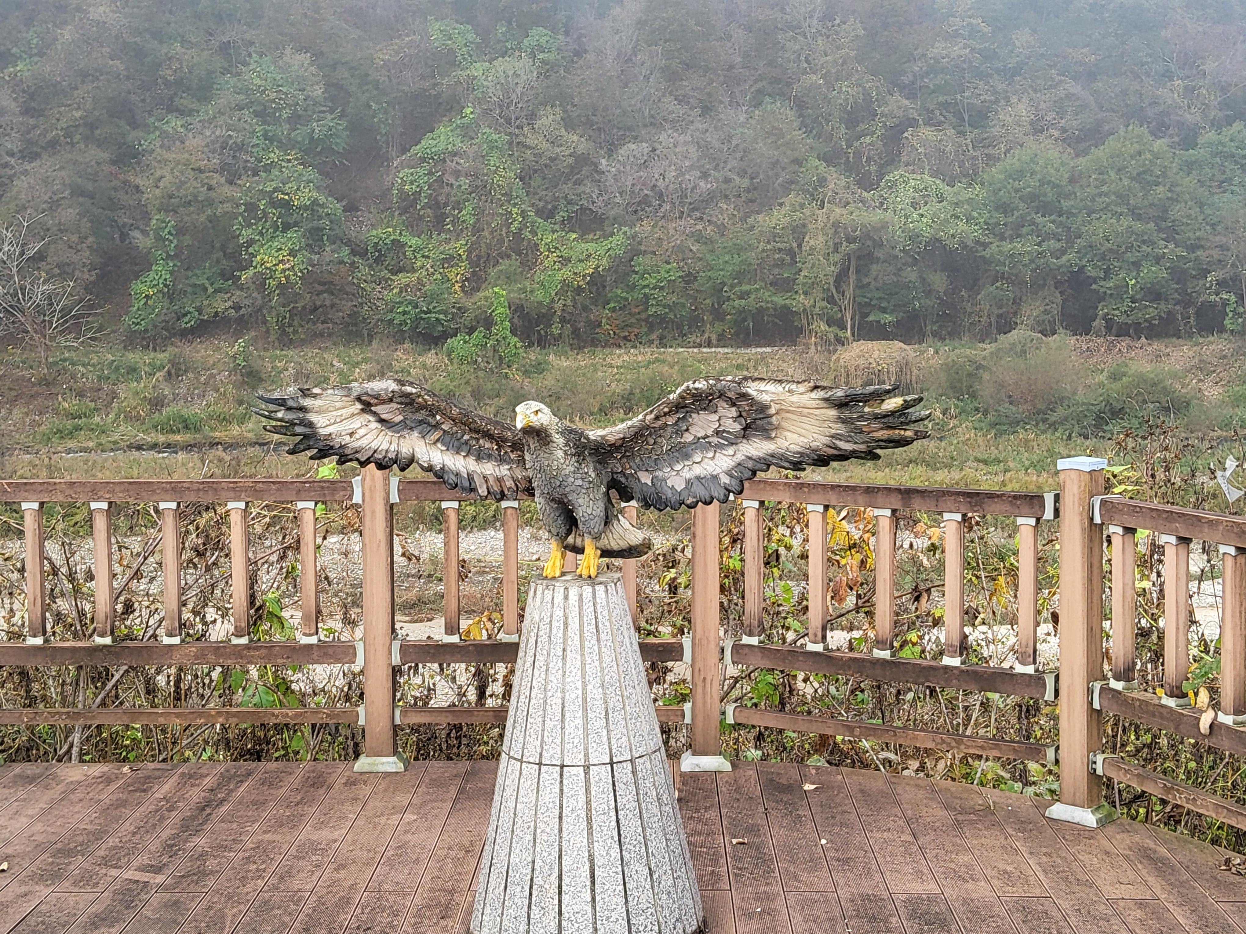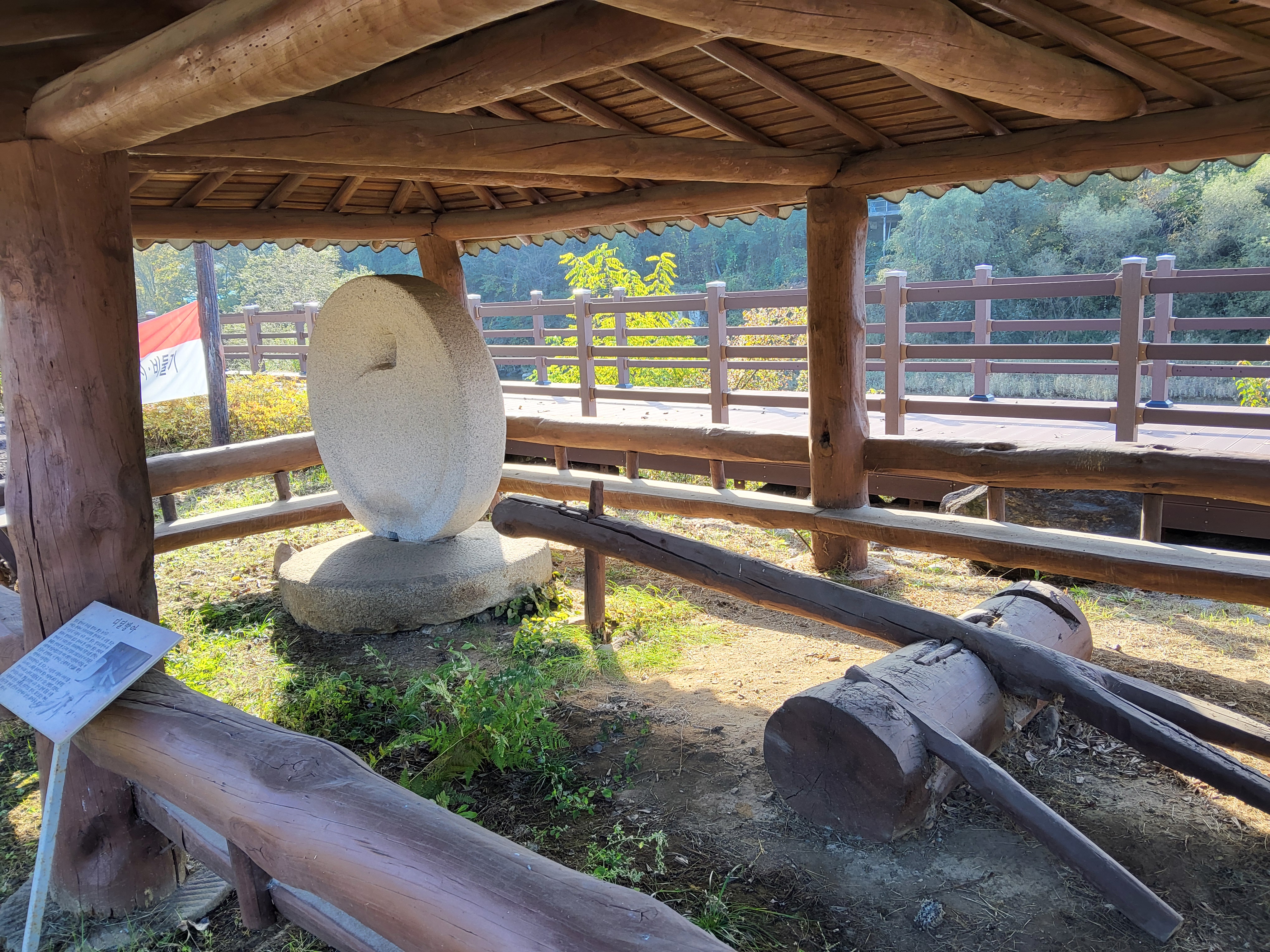 계속 수입천 가를 따라가며 안개가 제법 끼어 색다른 멋을 자아내는 풍경을 즐기며 가니 요즈음은 거의 보기가 어려운 디딜방아를 보존하고 있는 조그마한 정자 모양이 보였다. 우리의 옛 생활 모습을 엿볼 수 있는 도구를 이렇게 보존하고 있는 것도 참 좋은 모양이었다.