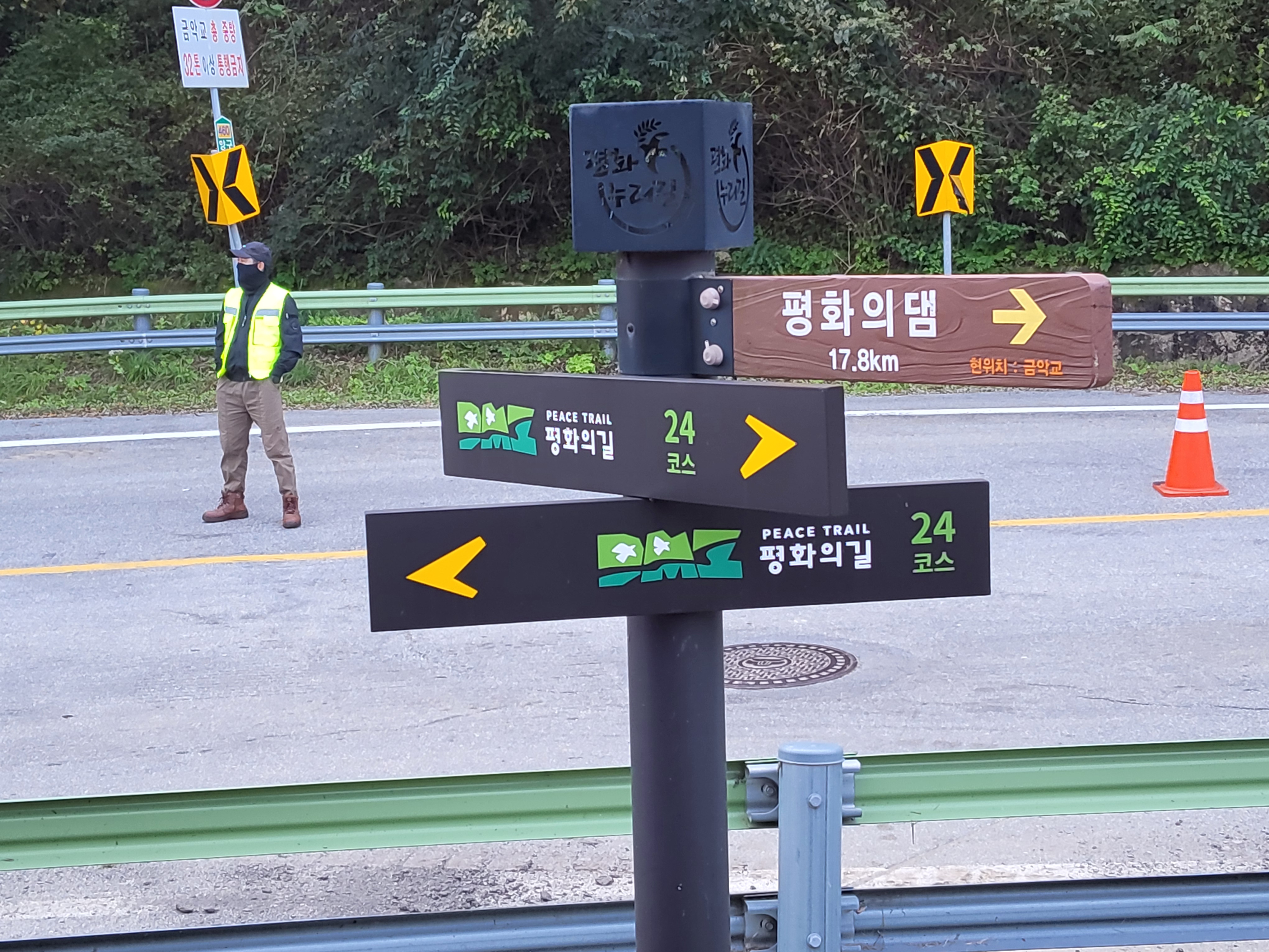 편안하게 도로를 따라 길을 걸어 각시교를 지나니 앞에서 겄던 길과 마주친다.계속해서 길을 가니 금악교가 나오고 다리를 건너니 평화의 길 안내 말뚝이 서 있는데 누가 실수를 했는지 모르겠으나 '평화의 길 24코스'라고 표기되어 있다. 그래서 조금 가서 편의점에서 커피를 한잔 구입해 마시면서 '한국의 길과 문화'에 전화를 해서 길 표시가 잘못된 말뚝과 수입천을 건너는 코스의 불편함과 어려움을 이야기하고 우회로를 정식 코스로 정하는 것이 옳겠다고 의견을 말해 주었다.