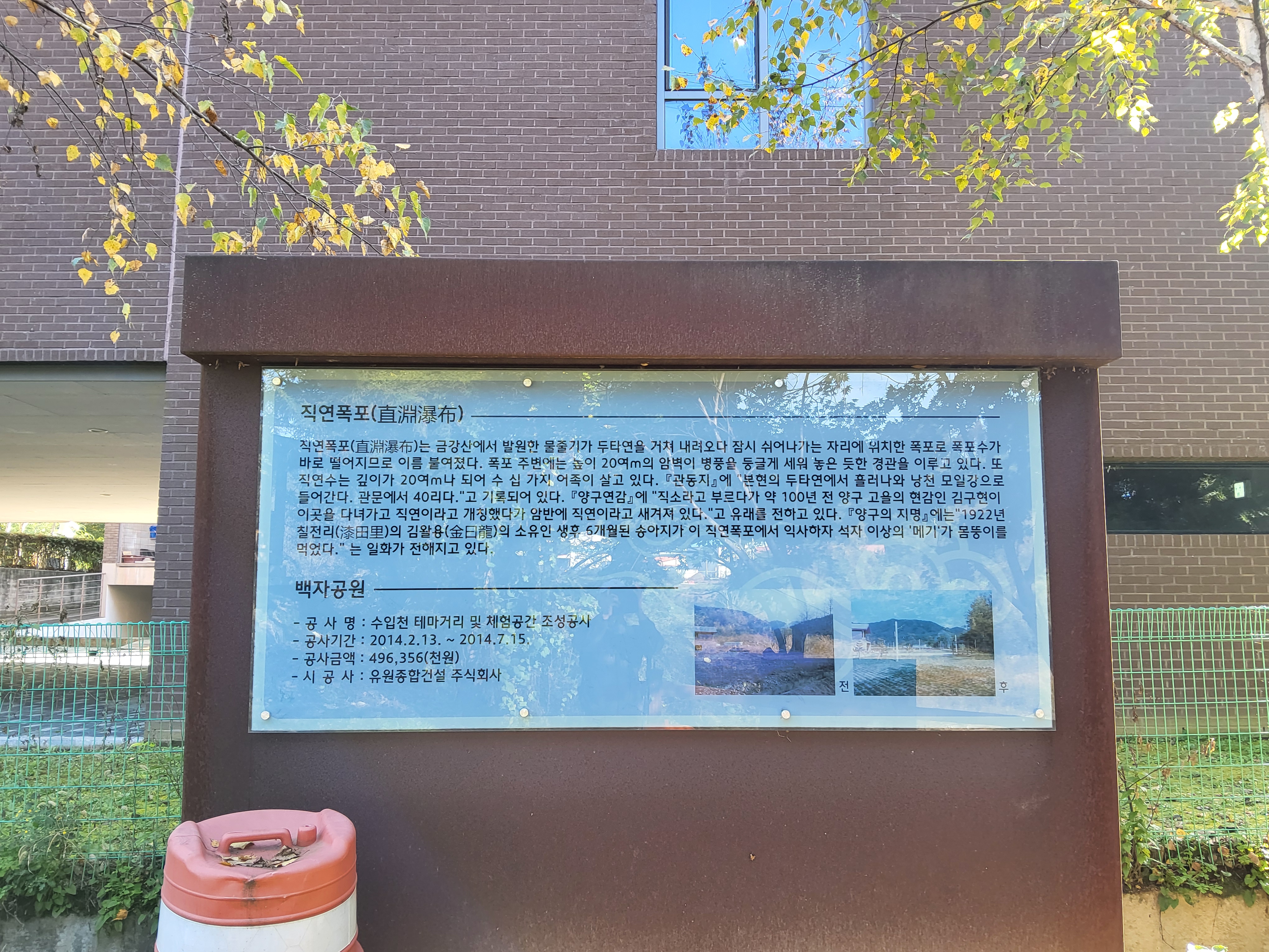 백자박물관 옆으로 난 길을 따라가니 계곡이 나오고 직연폭포라는 이름이 붙은 조그만 팻말이 있고 계곡에는 크지 않은 폭포가 있다. 직연폭포는 파로호로 흘러드는 수입천 하상에 발달한 높이 15m의 폭포이다. 직연폭포는 아름다운 자연경관을 자랑하는 대표적인 관광지 중 하나로, 폭포로 가는 길에는 산책로가 조성되어 있어 폭포를 조망하기에 좋다. 물줄기가 곧바로 떨어져 직연폭포라 부르며, 주변에는 높이 약 20m의 암벽이 병풍을 둘러친 것처럼 아름다운 경치를 드러내고 있다. 여름에는 사람들이 물놀이를 즐기러 찾는 인기 명소이기도 하며, 산책로와 등산로가 마련되어 있어 다양한 활동을 즐길 수 있다.