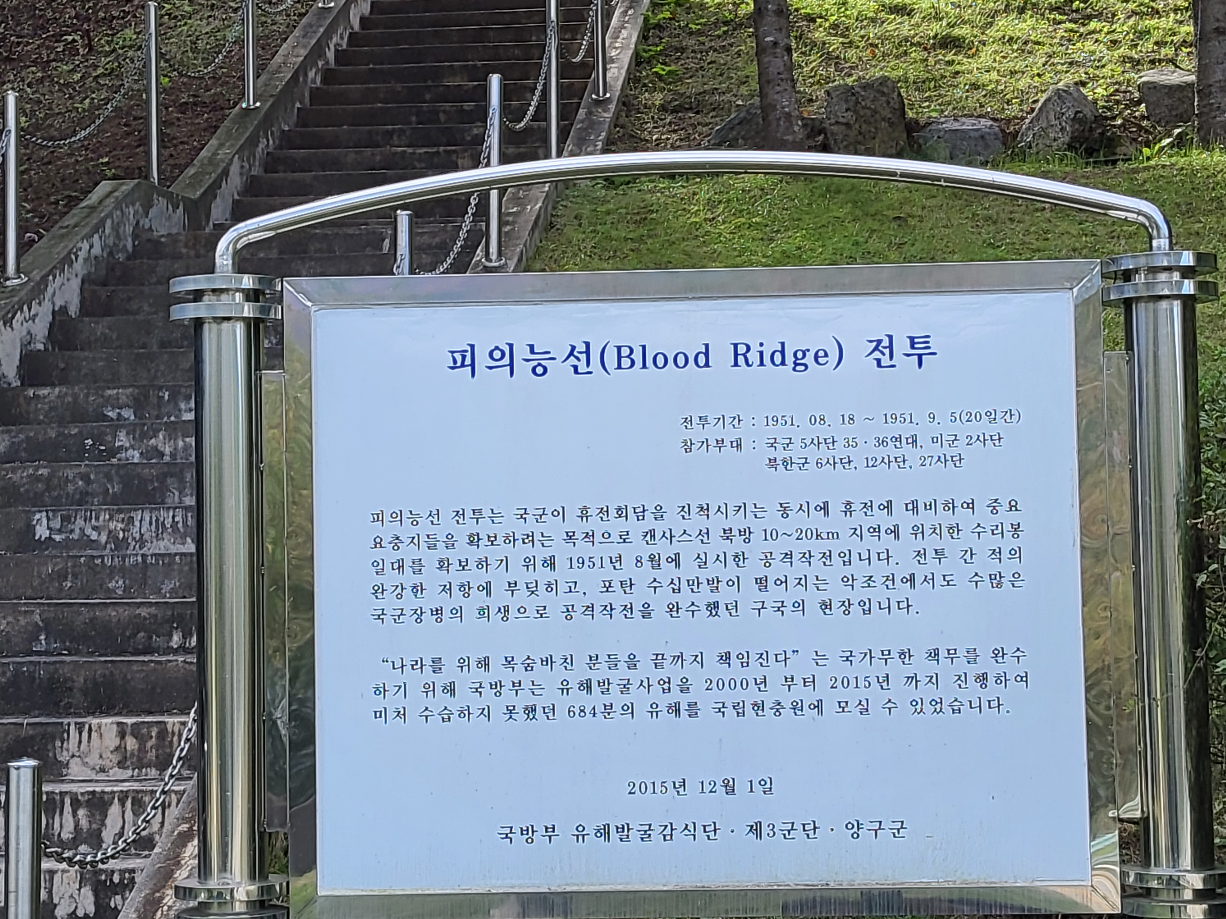 피의능선전투는 국군이 휴전회담을 진척시키는 동시에 휴전에 대비하여 중요 요충지들을 확보하려는 목적으로 캔사스선 북방 10~20㎞ 지역에 위치한 수리봉 일대를 확보하기 위해 1951년 8월 17일부터 9월 3일까지 벌인 전투다. 피의 능선(稜線)이란 『Star and Stripes』지가 지은 이름으로 3개의 고지 즉 983고지 · 940고지 · 773고지와 연결된 산맥으로 이루어진 능선을 말한다. 전투 간 적의 완강한 저항에 부딪히고 포탄 수십만 발이 떨어지는 악조건에서도 수많은 국군장병의 희생으로 승리를 이루었던 구국의 현장이다. “나라를 위해 목숨 바친 분들을 끝까지 책임진다”는 국가 무한책무를 완수하기 위해 국방부는 유해발굴사업을 2000년부터 2015년까지 진행하여 미처 수습하지 못했던 684분의 유해를 국립현충원에 모셨다.