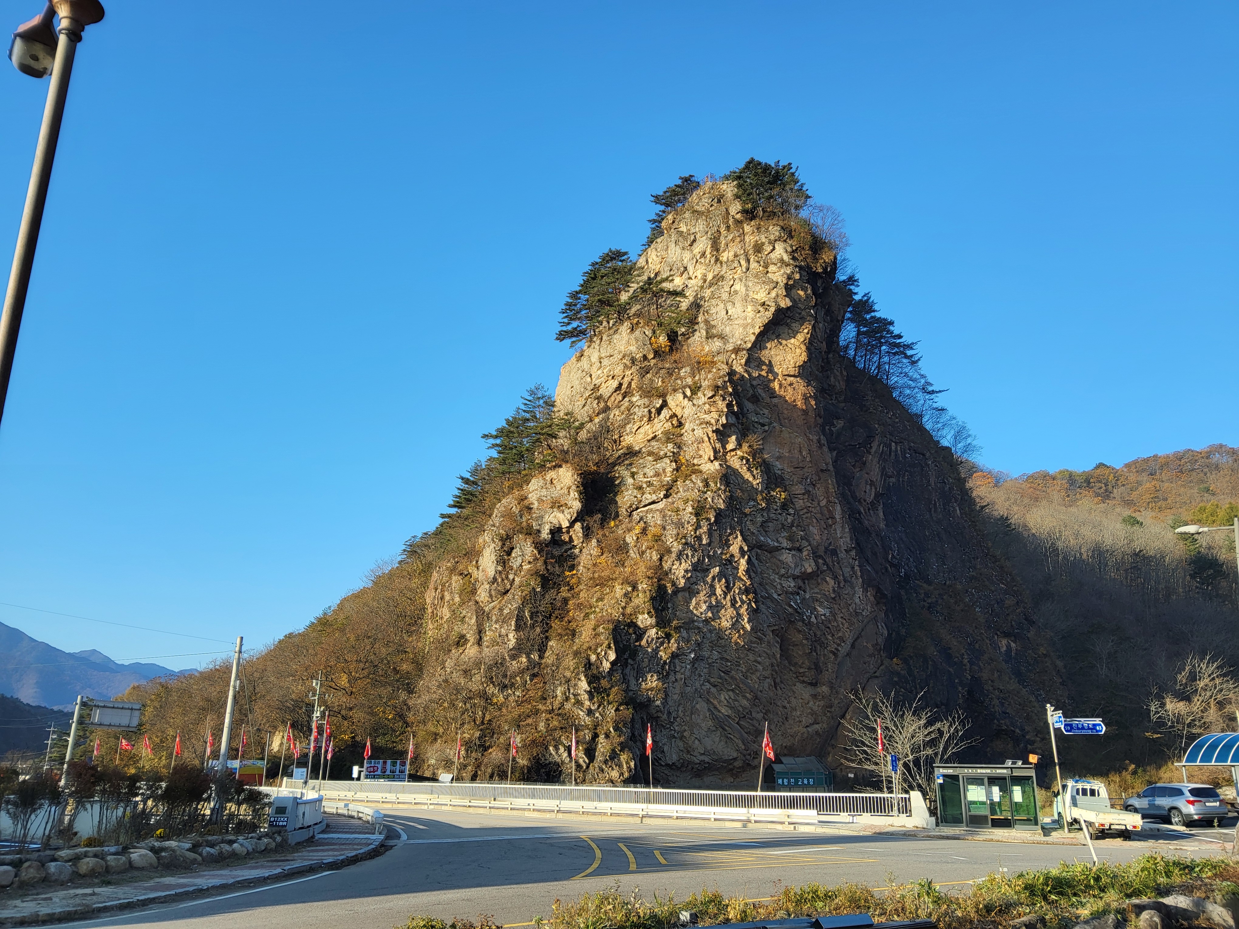 용대삼거리는 제법 번화한 거리였다. 많은 음식점과 편의점 그리고 탁 트인 거리와 복바위라고 불리는 큰 바위가 나를 맞이하는 것 같았다. 여기서부터 진부령미술관까지는 차량이동구간이라고 두루누비 앱에 나와 있기에 주변 상인에서 버스 시간을 물으니 상당히 오래 기다려야 했다. 그래서 먼저 백골병단전적비를 보러 갔다.