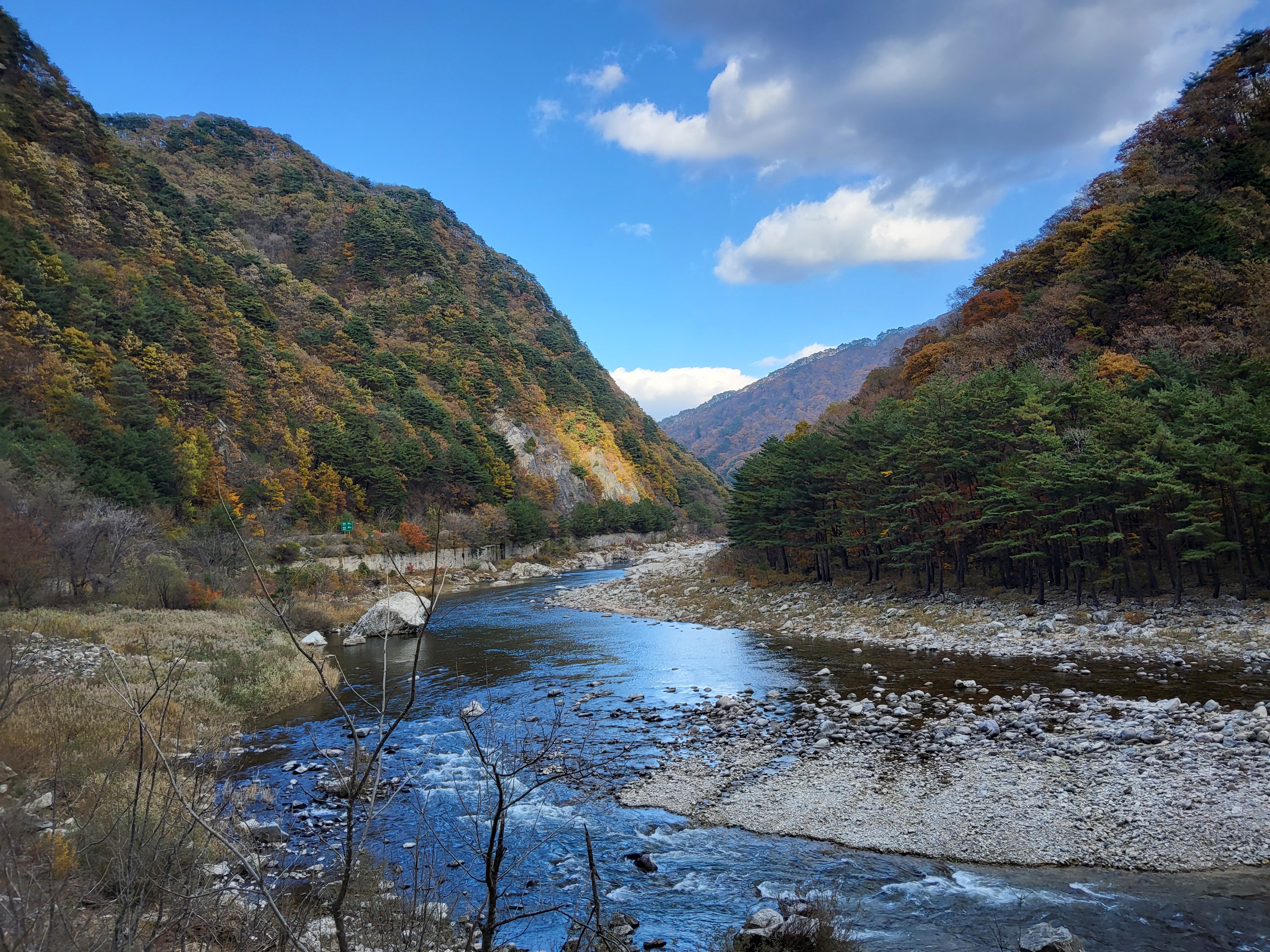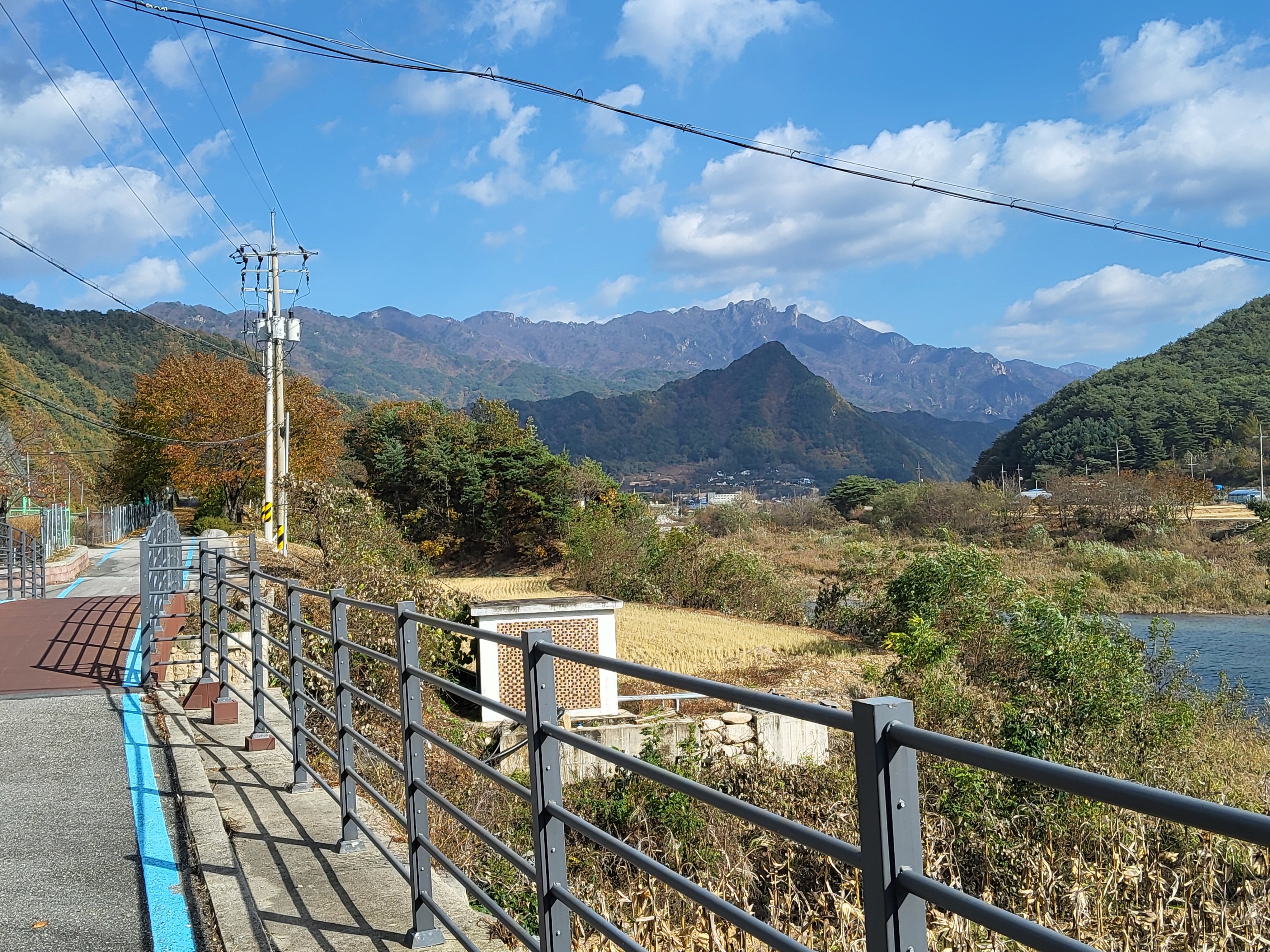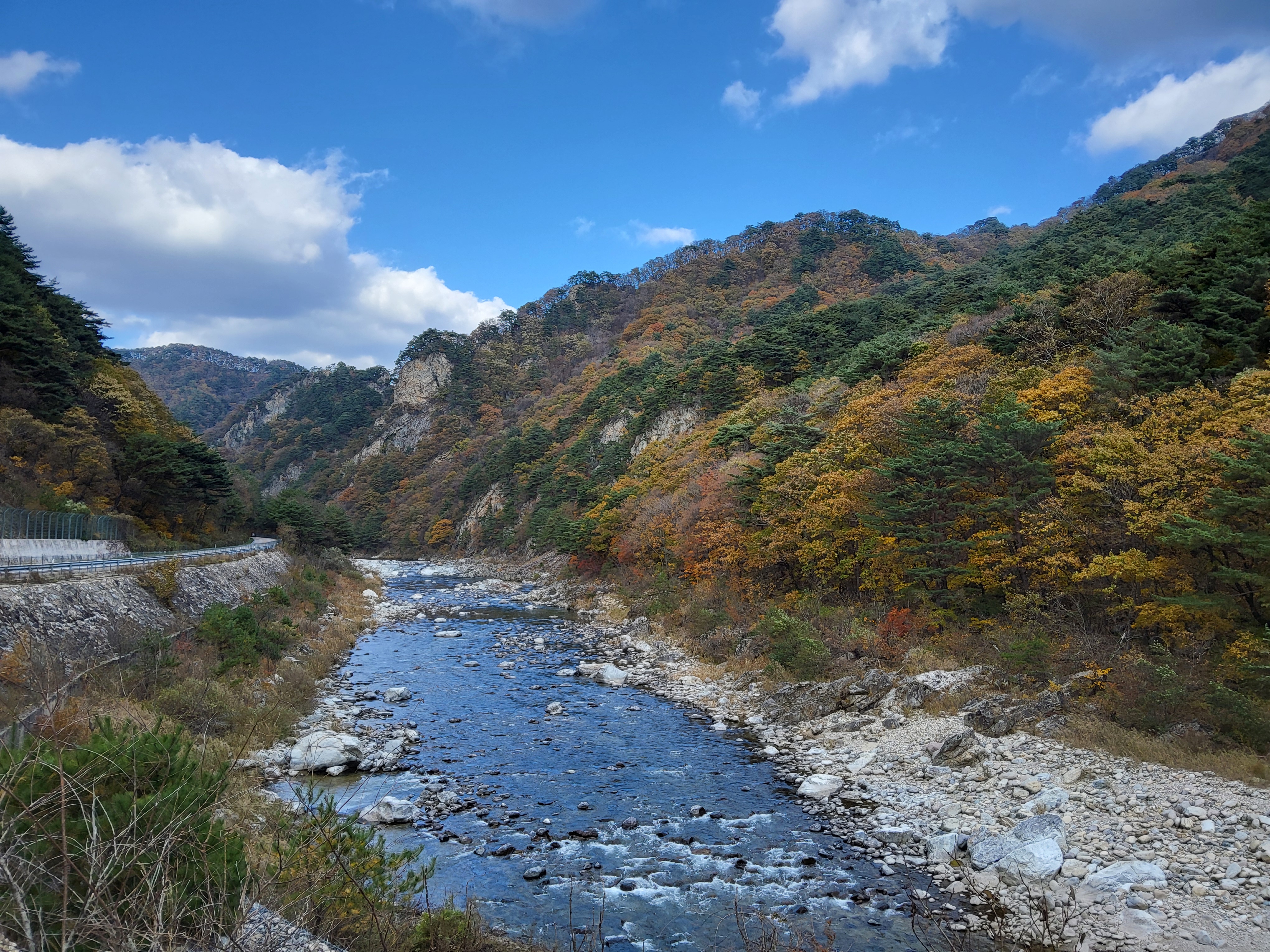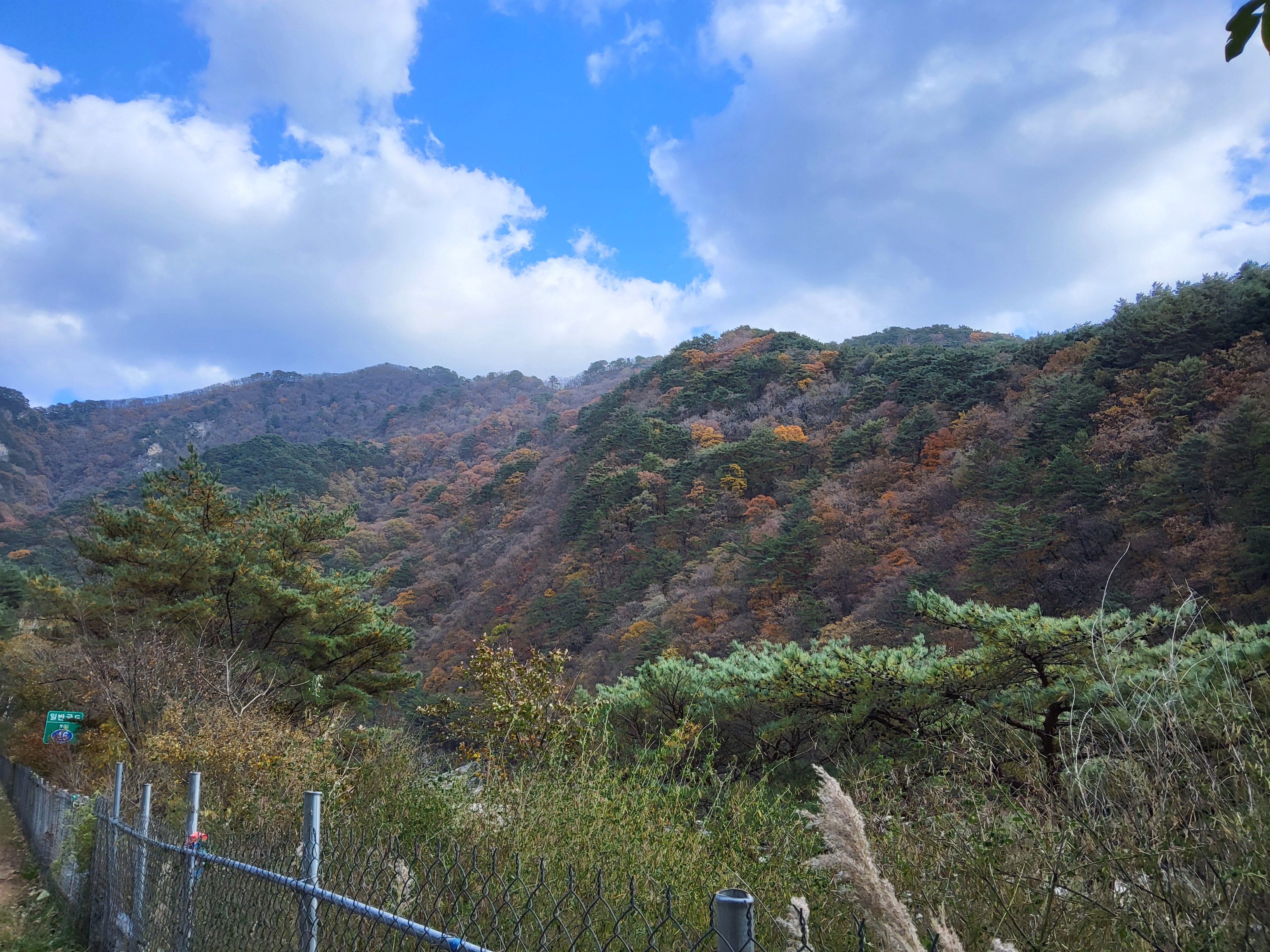 북천을 따라 걸어가면서 전형적인 푸른 가을 하늘을 보니 가슴이 탁 트이었다. 이제 설악의 권역으로 들어가기 시작했다. 큰 도로 옆에 있는 옛 46번 도로를 따라 걸으니 설악광장이 나타나고 계속 걸어서 한계령 계곡으로 들어갔다.