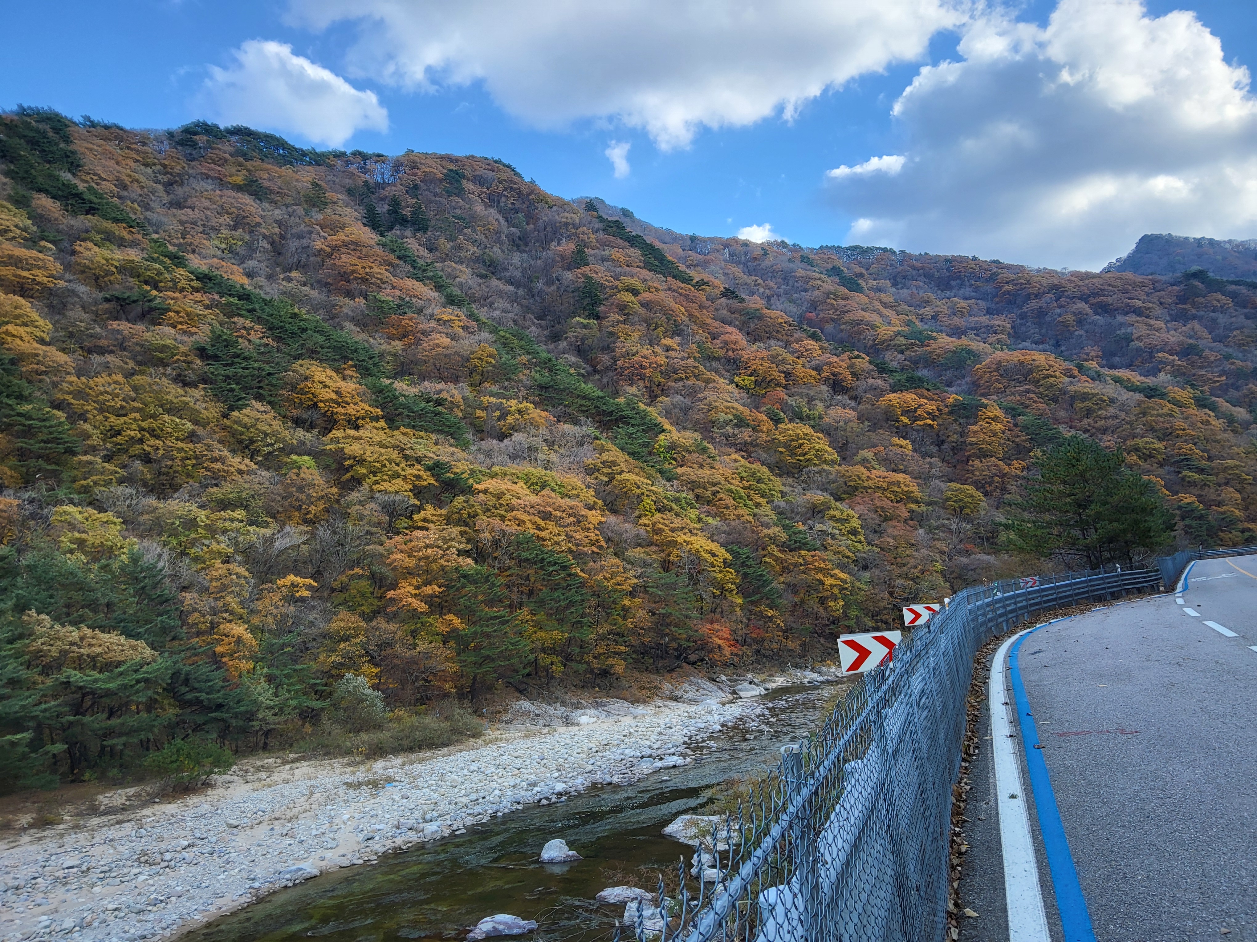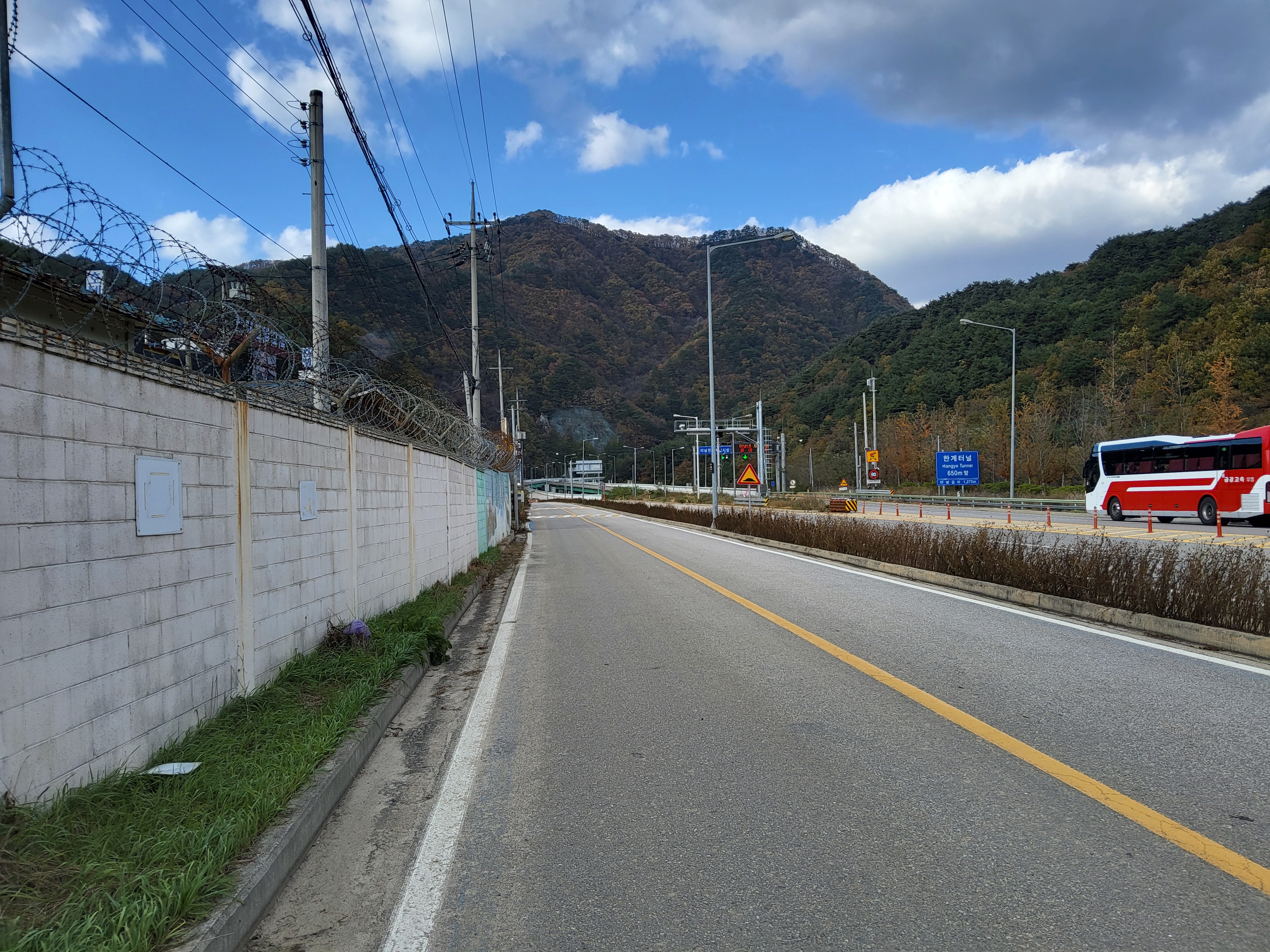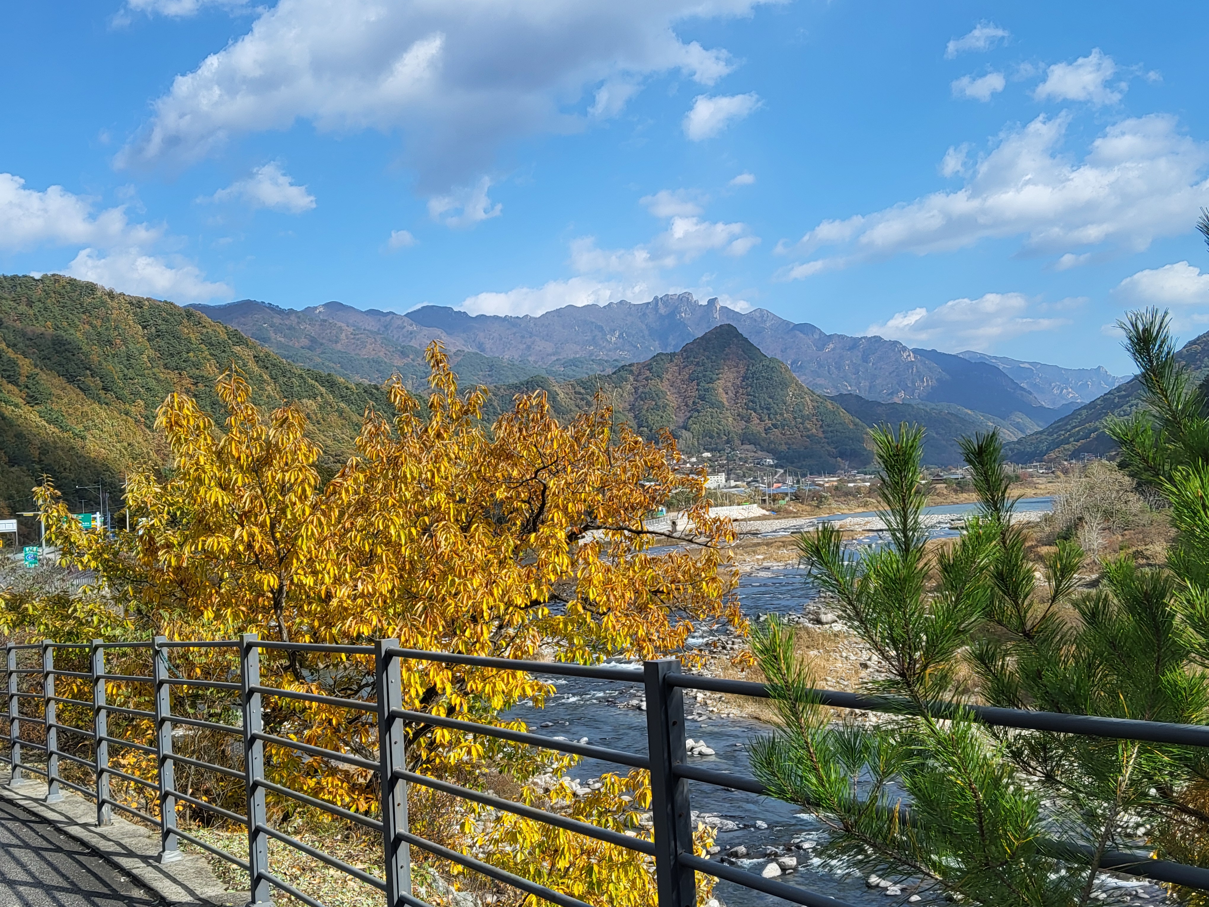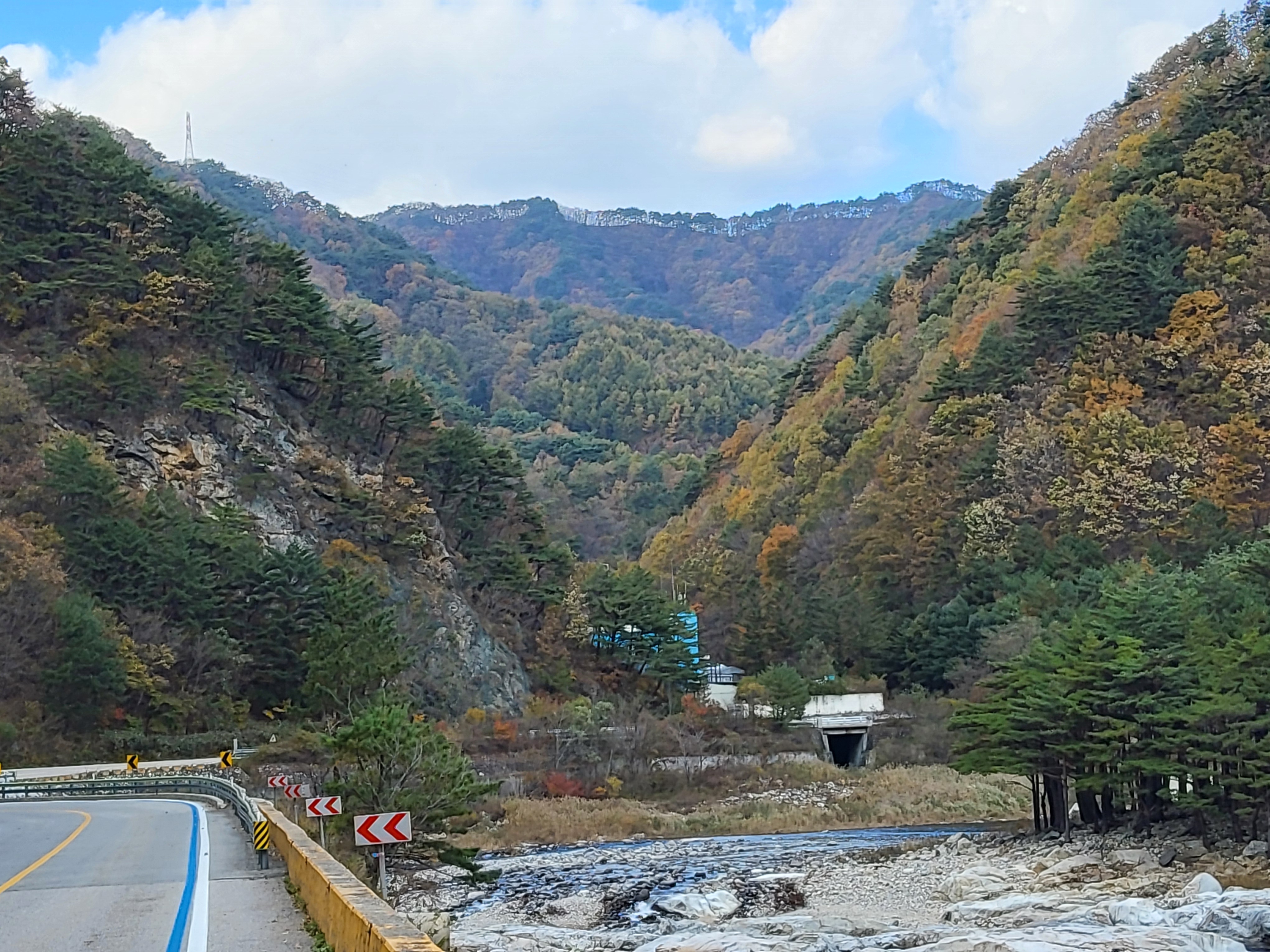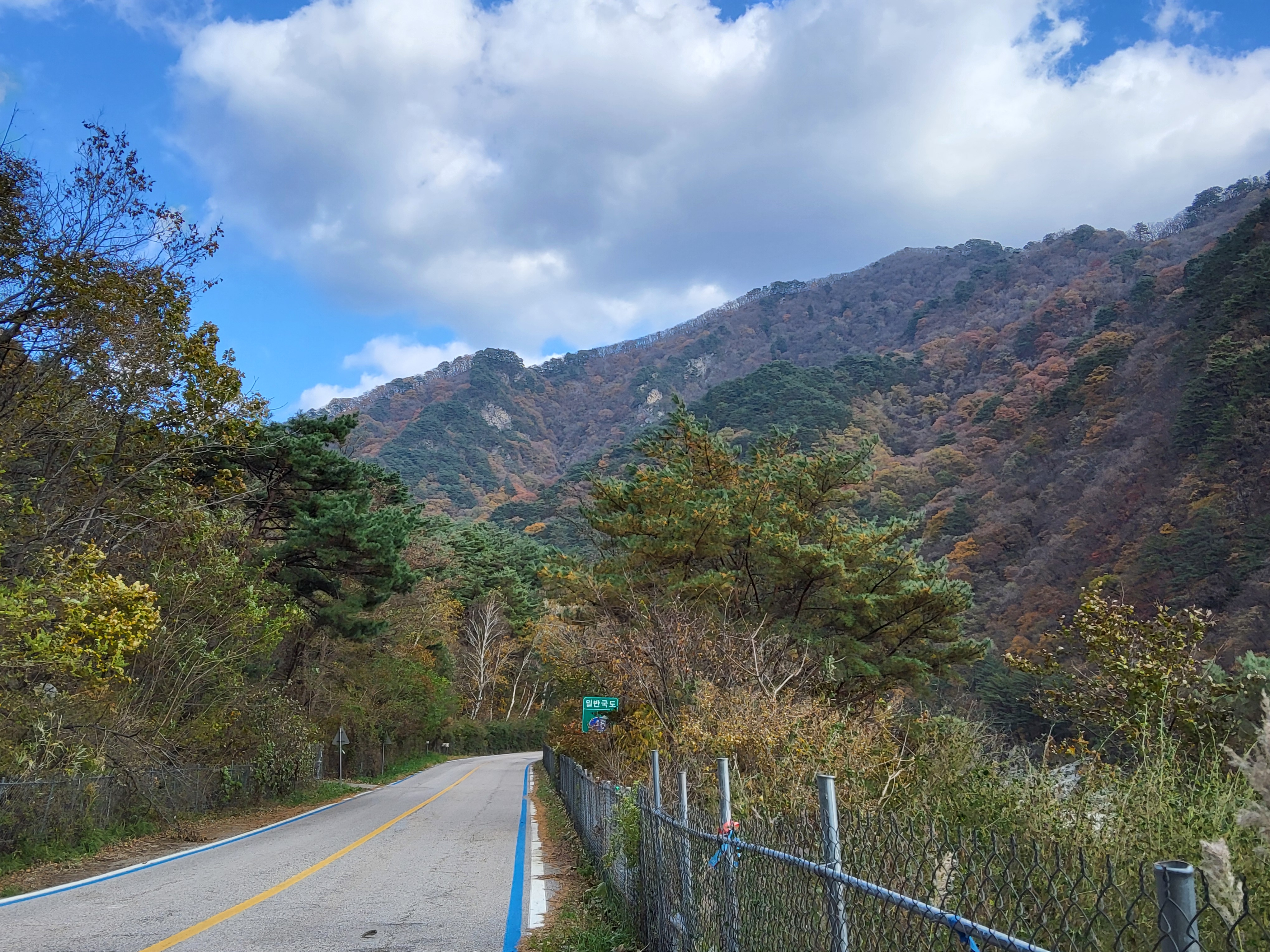 북천을 따라 걸어가면서 전형적인 푸른 가을 하늘을 보니 가슴이 탁 트이었다. 이제 설악의 권역으로 들어가기 시작했다. 큰 도로 옆에 있는 옛 46번 도로를 따라 걸으니 설악광장이 나타나고 계속 걸어서 한계령 계곡으로 들어갔다.