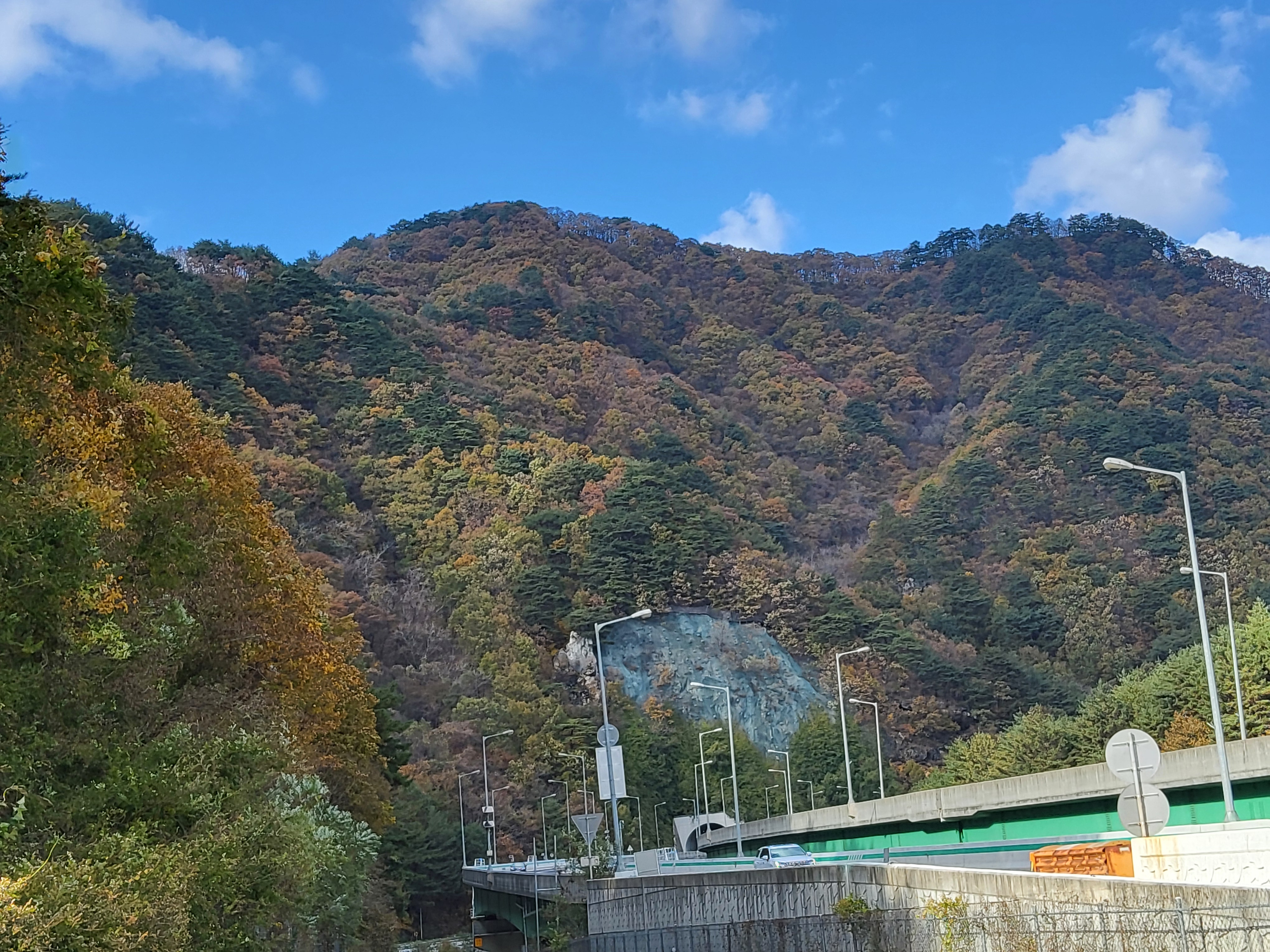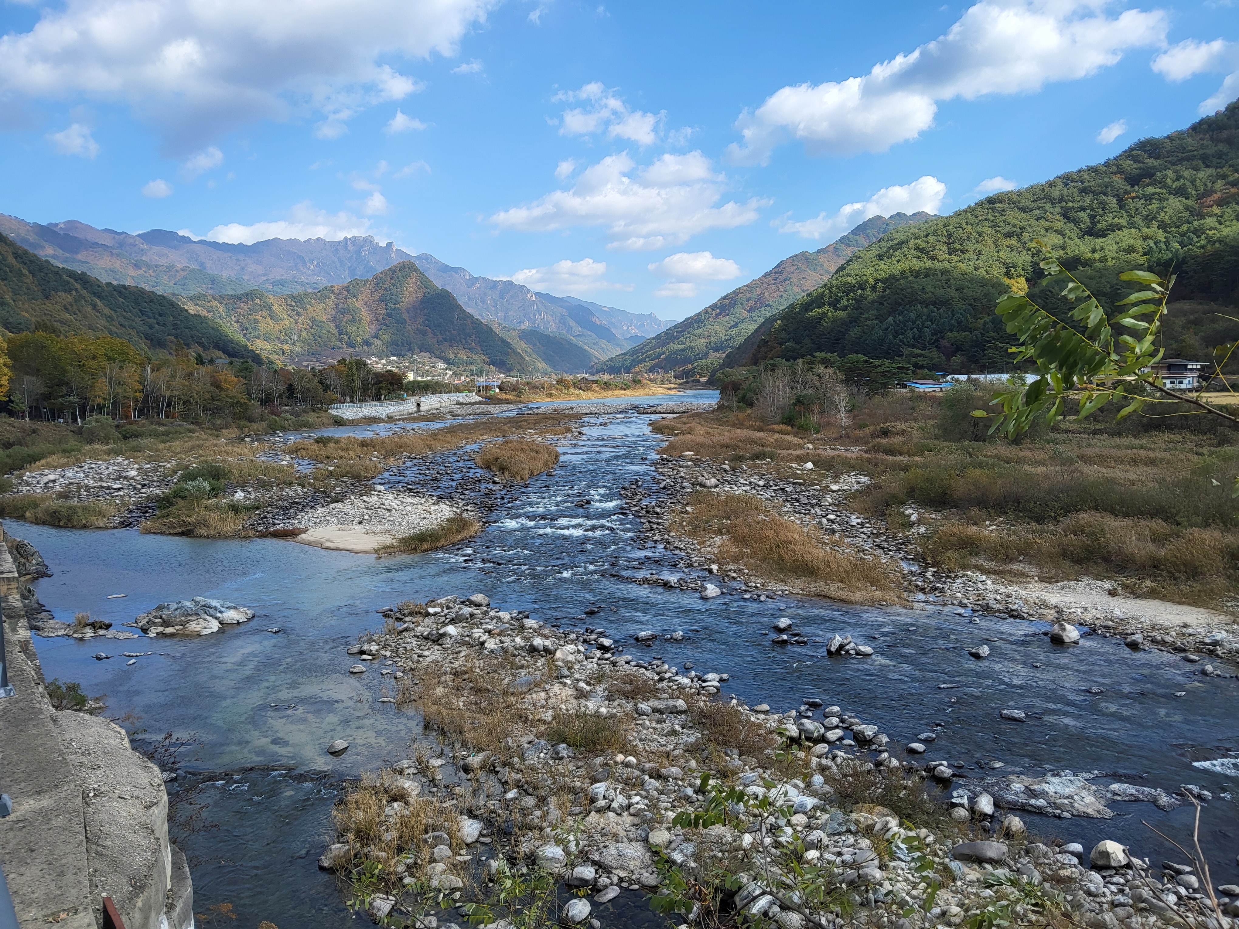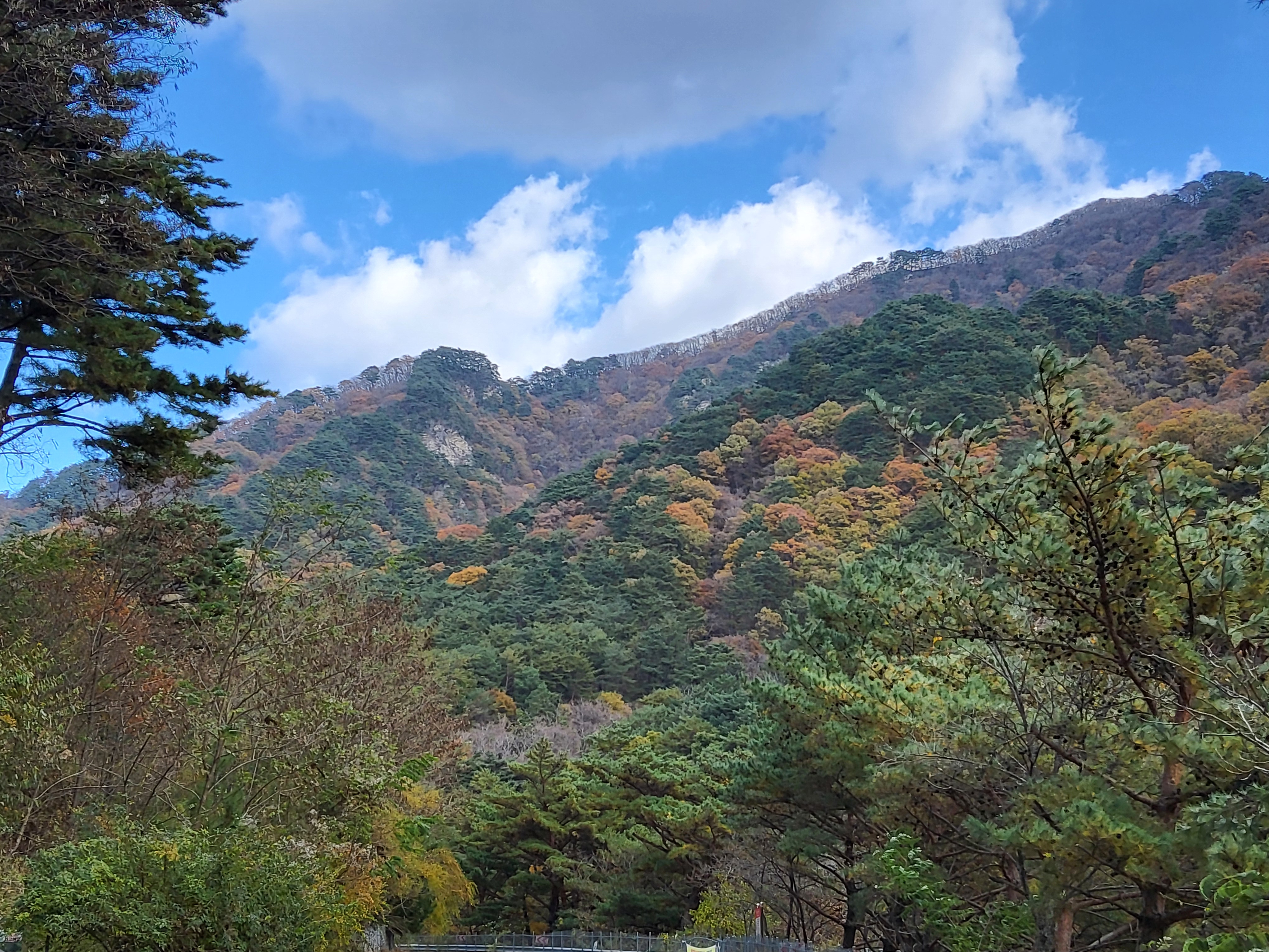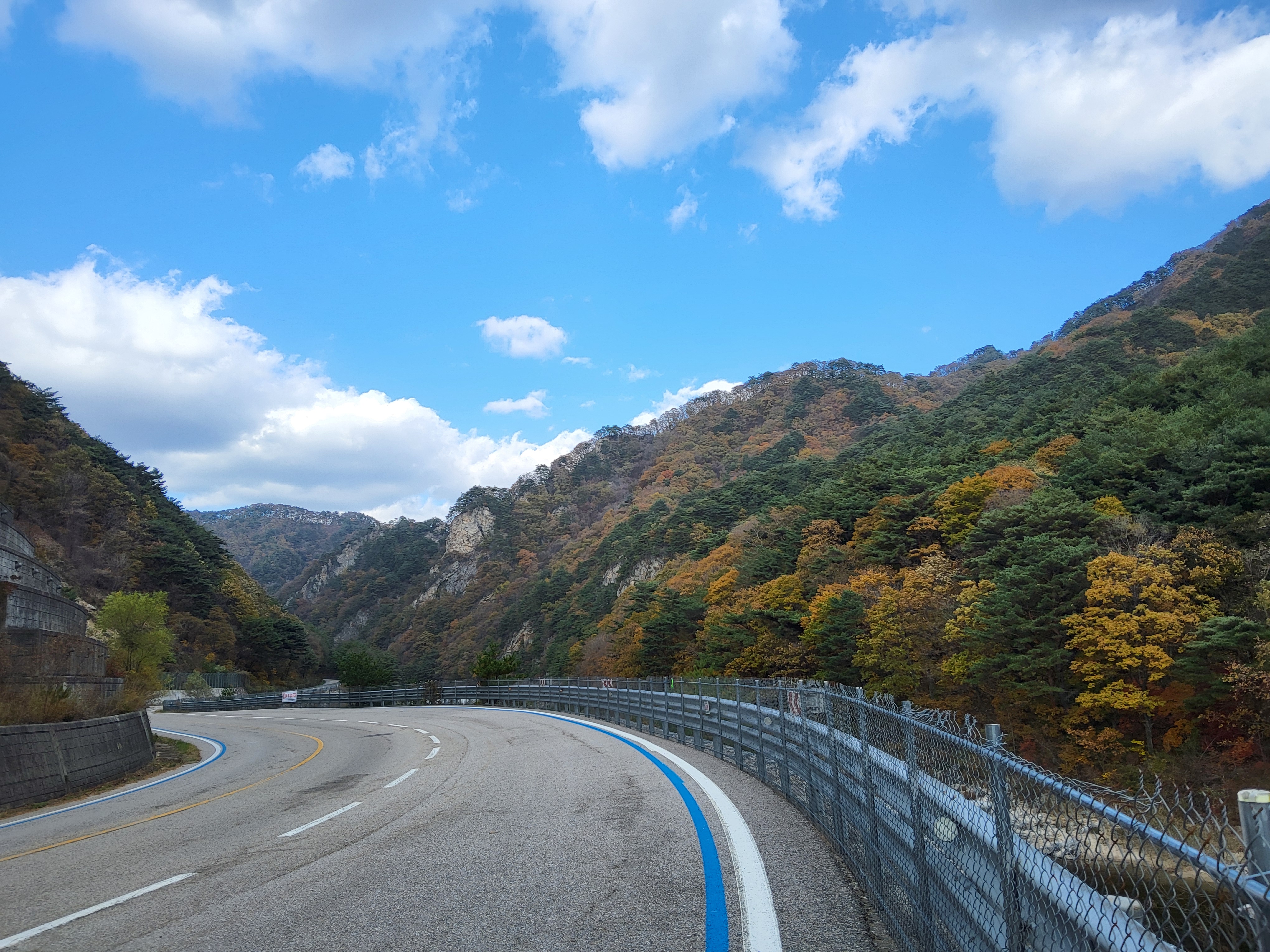 북천을 따라 걸어가면서 전형적인 푸른 가을 하늘을 보니 가슴이 탁 트이었다. 이제 설악의 권역으로 들어가기 시작했다. 큰 도로 옆에 있는 옛 46번 도로를 따라 걸으니 설악광장이 나타나고 계속 걸어서 한계령 계곡으로 들어갔다.