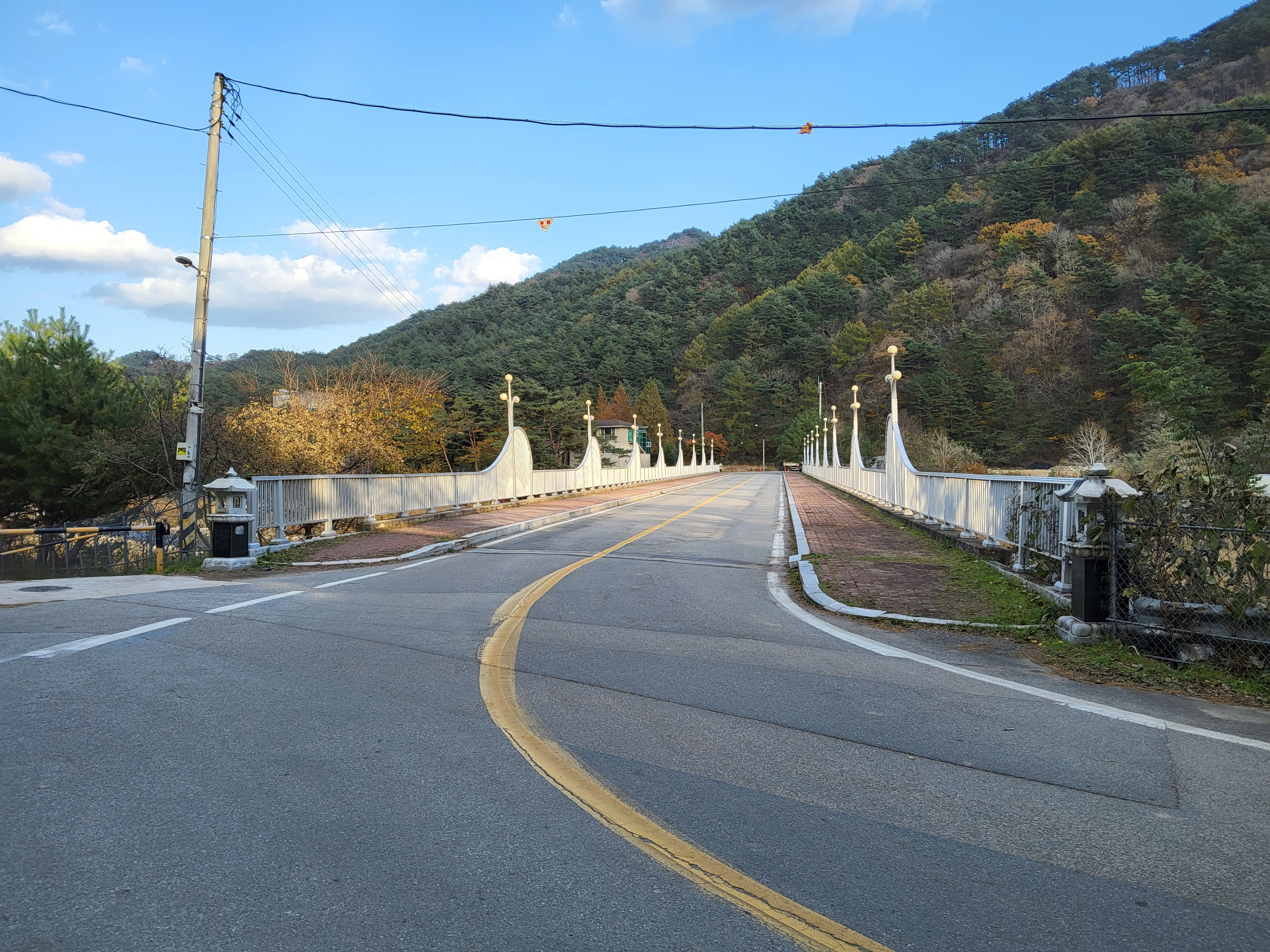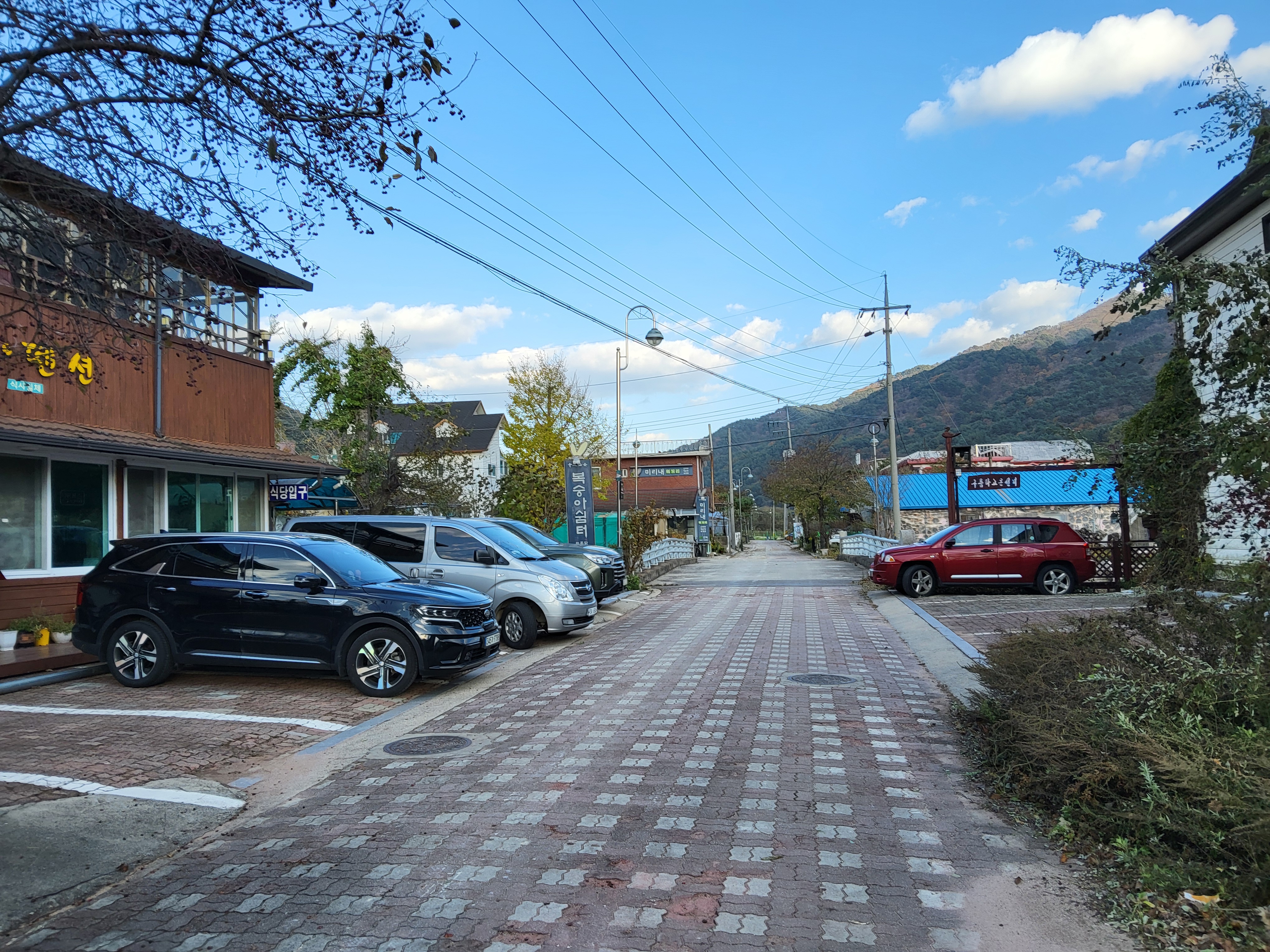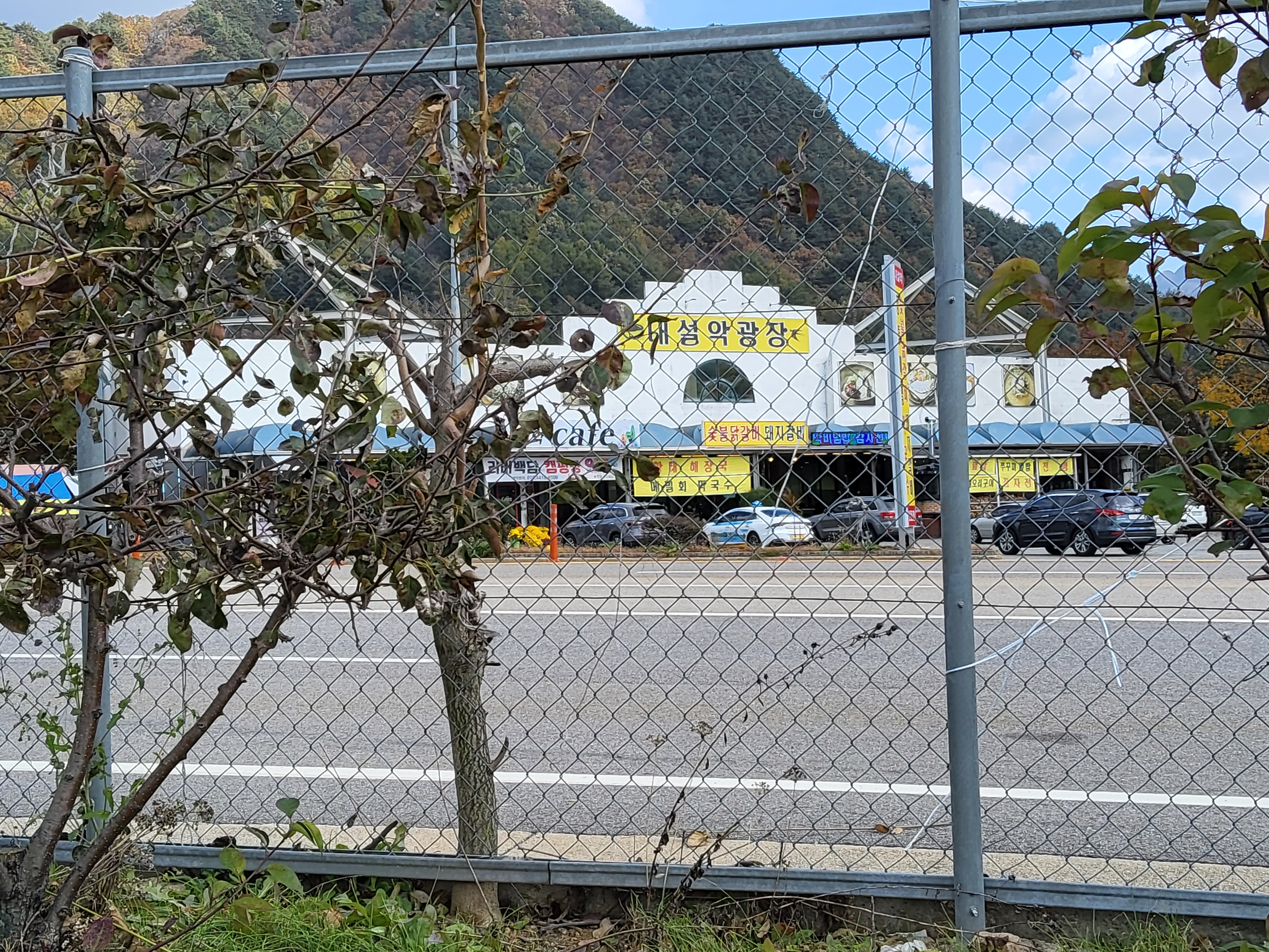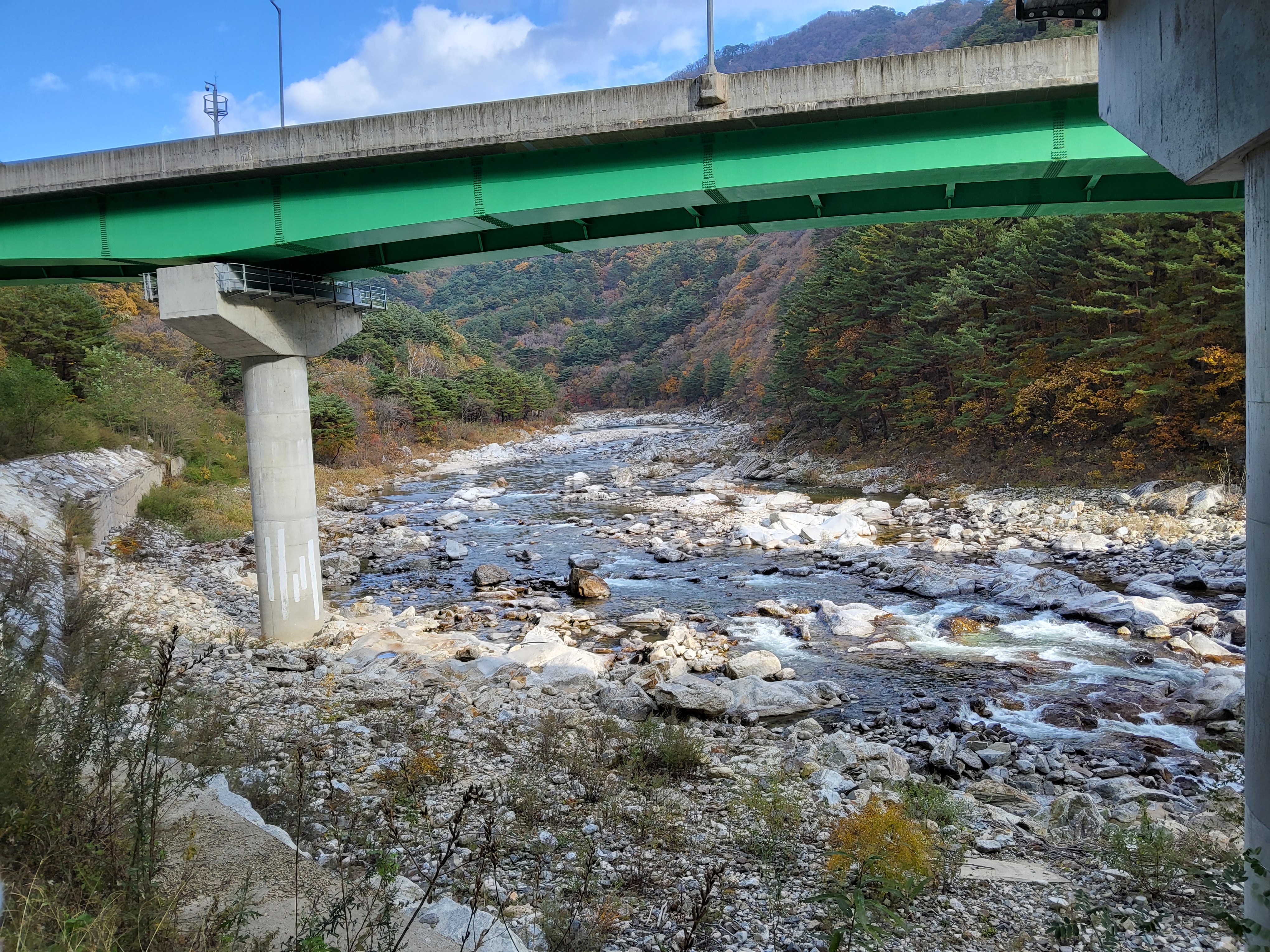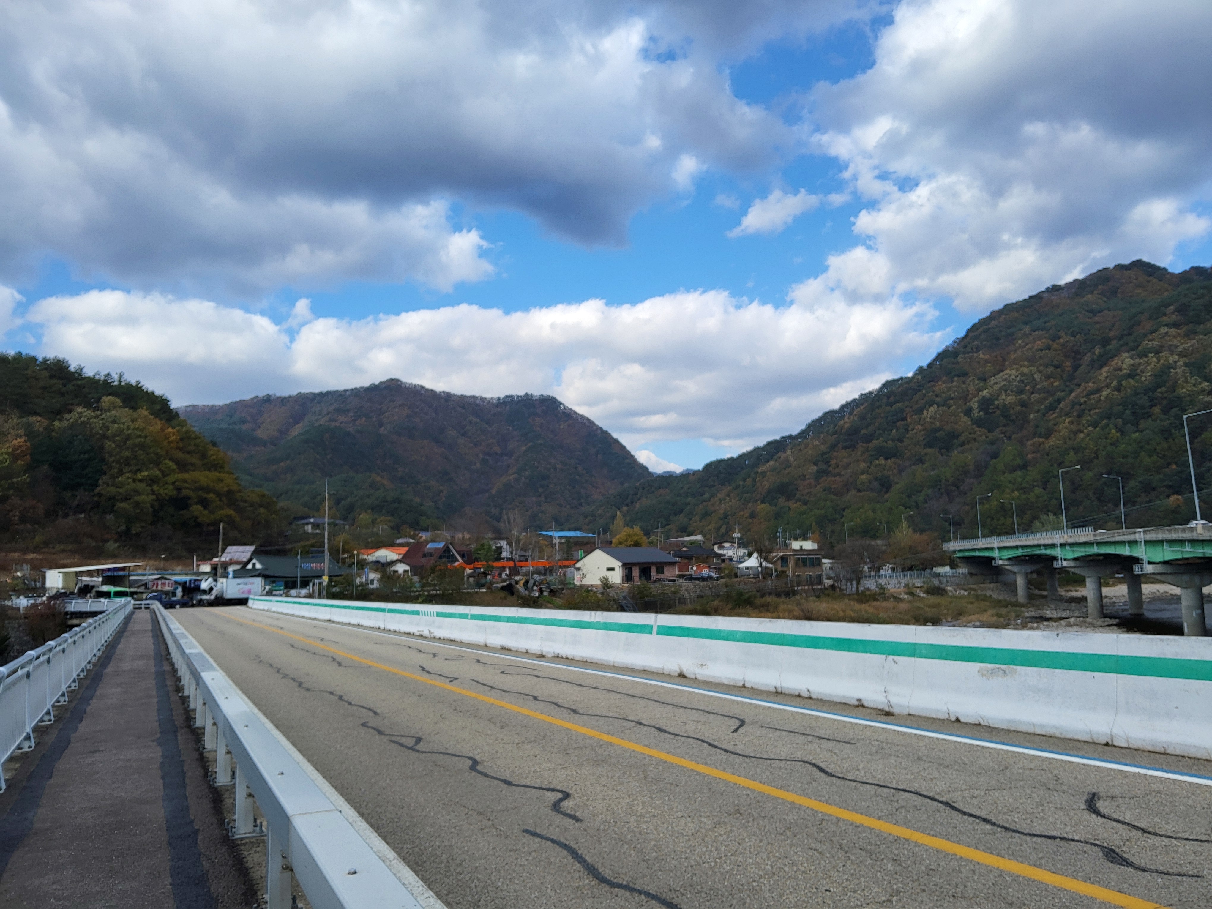 북천을 따라 걸어가면서 전형적인 푸른 가을 하늘을 보니 가슴이 탁 트이었다. 이제 설악의 권역으로 들어가기 시작했다. 큰 도로 옆에 있는 옛 46번 도로를 따라 걸으니 설악광장이 나타나고 계속 걸어서 한계령 계곡으로 들어갔다.