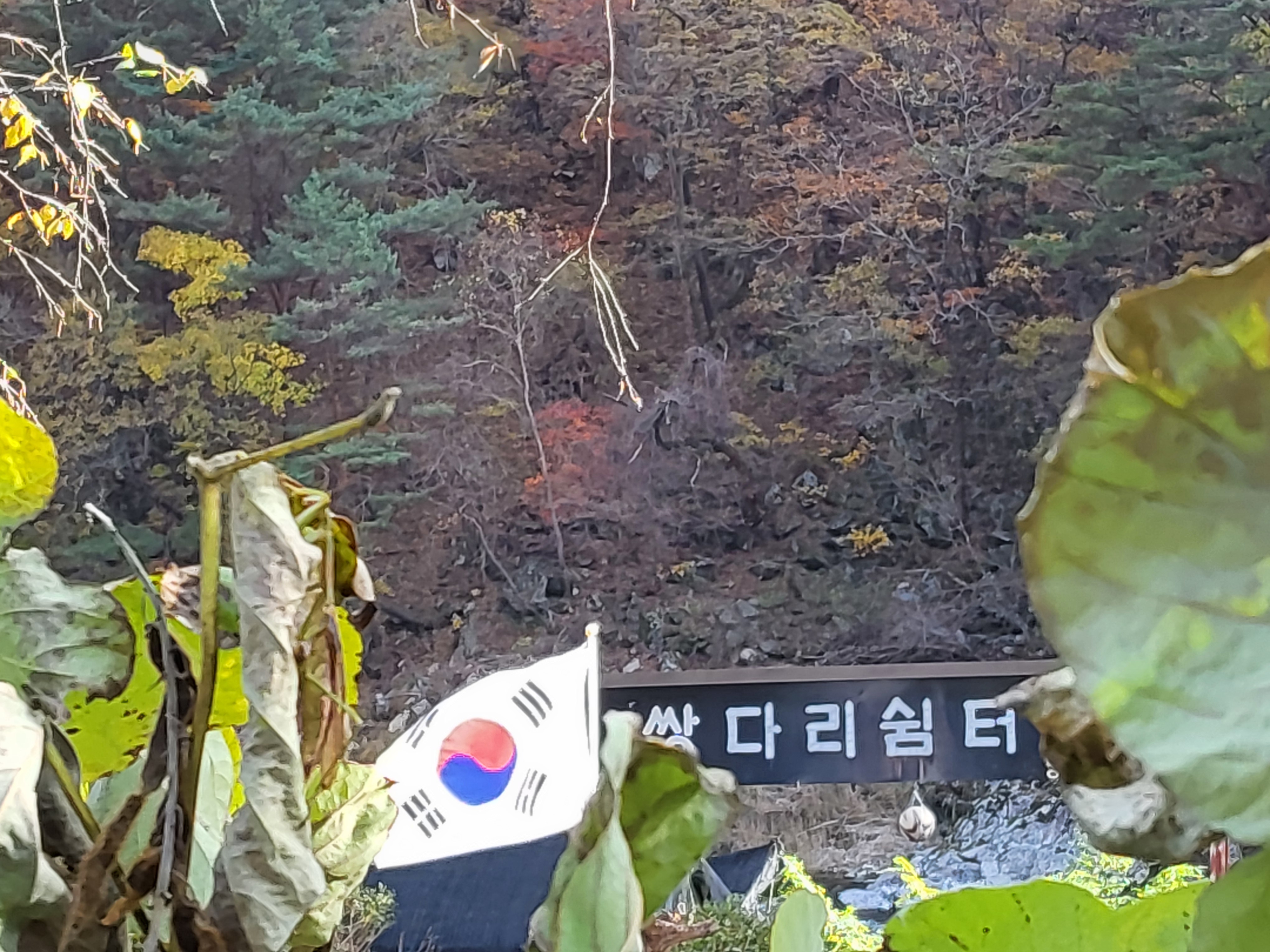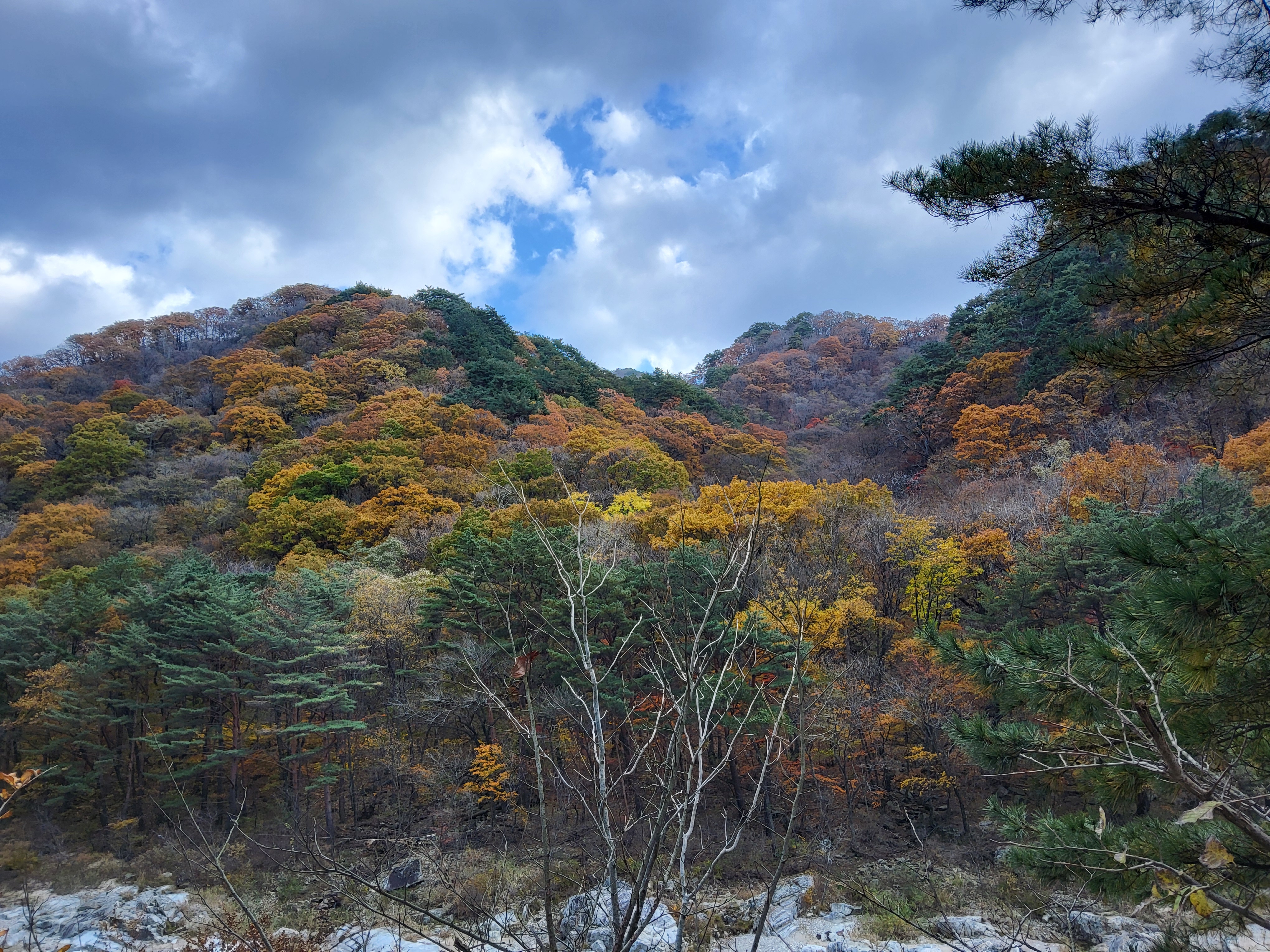 한계천을 따라 걸으며 보는 단풍은 설악의 다른 어디보다 못하지 않게 아름답다. 주전골, 오색, 내설악 등등 많은 설악의 단풍을 구경했는데 한계 시냇가의 단풍은 자기 나름의 아름다움을 가지고 있었다. 특히 올해는 여름에 너무 더웠고, 10월에도 강원도 설악권 일대에 25일간이나 비가 왔다는 주민들의 말에 의하면 단풍이 제대로 들지 않았을 것인데 그래도 한계의 단풍은 아름다웠다. 옛 46번 도로를 따라 걸으니 이 아름다운 길을 걷는 사람은 나 하나밖에 없다. 이 아름다운 자연의 풍광을 혼자서 만끽하는 즐거움을 마음껏 누리면서 흥겨운 마음으로 길을 걸으니 승용차 한 대가 멈추면서 60정도 되어 보이는 여인이 내렸다. 그래서 잠시 인사를 하고 주변의 아름다운 단풍을 즐기라고 이야기했다. 그 여인은 고맙다고 하면서 나에게도 조심해서 여행하라고 인사를 했다. 모두가 이 아름다운 자연의 풍경에 마음이 여유로워지고 감사하는 감정이 풍부해진 것같았다.