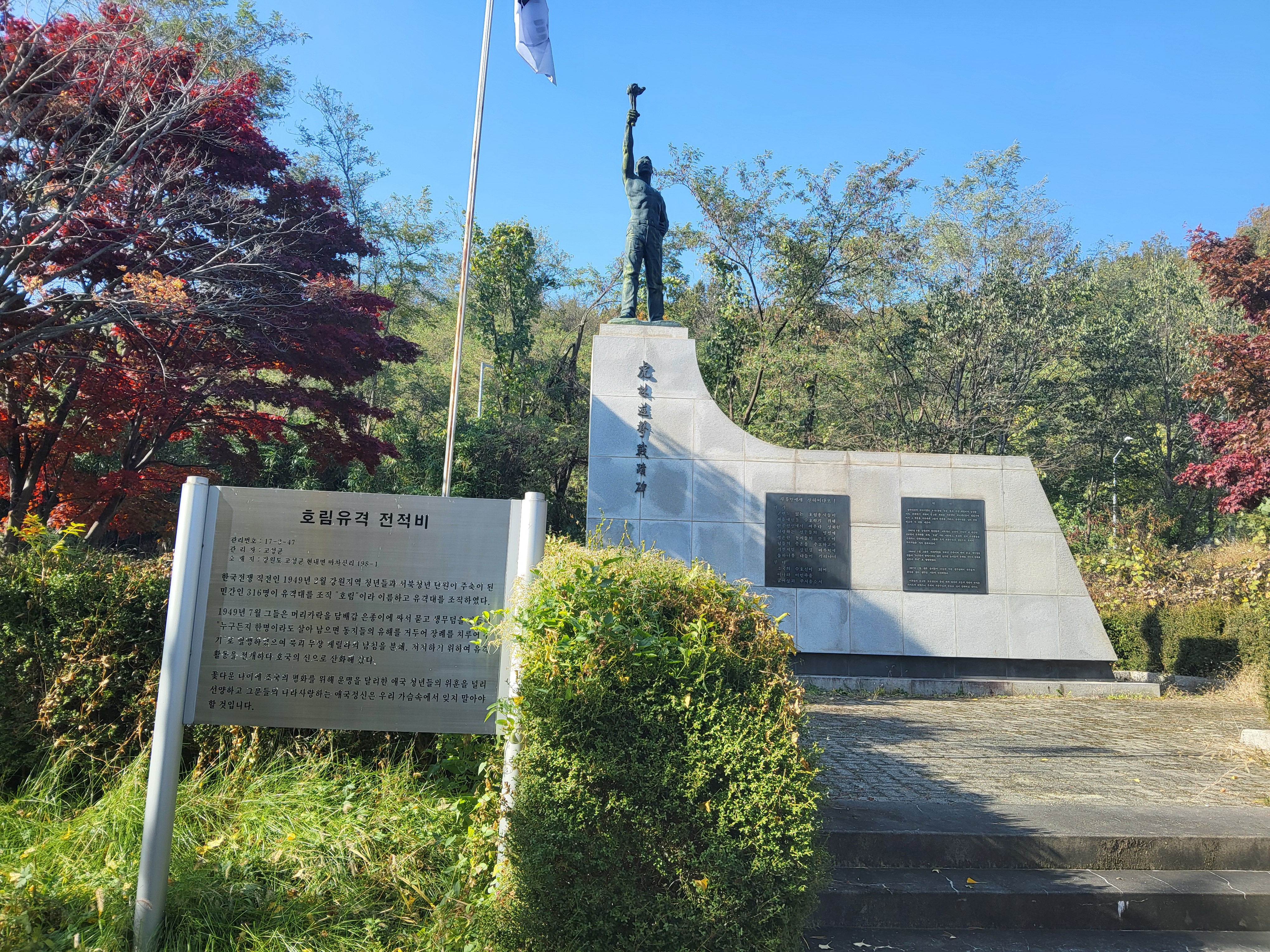 비로소 통일전망대로 가기 위해 반드시 거쳐야 하는 관문이 통일안보공원에 도착했다. 예전에 몇 번이나 와 본 곳으로 크게 변하지 않은 곳이다. 동해대로 방면 주차장 위쪽에 호림유격전적비는 한국전쟁 직전 북한 무장 게릴라의 남침을 저지하다가 희생된 호림유격대를 기리기 위해 조성했다. 전적비 상단에 횃불을 높이 든 유격대원 동상이 불굴의 기상을 보여준다.