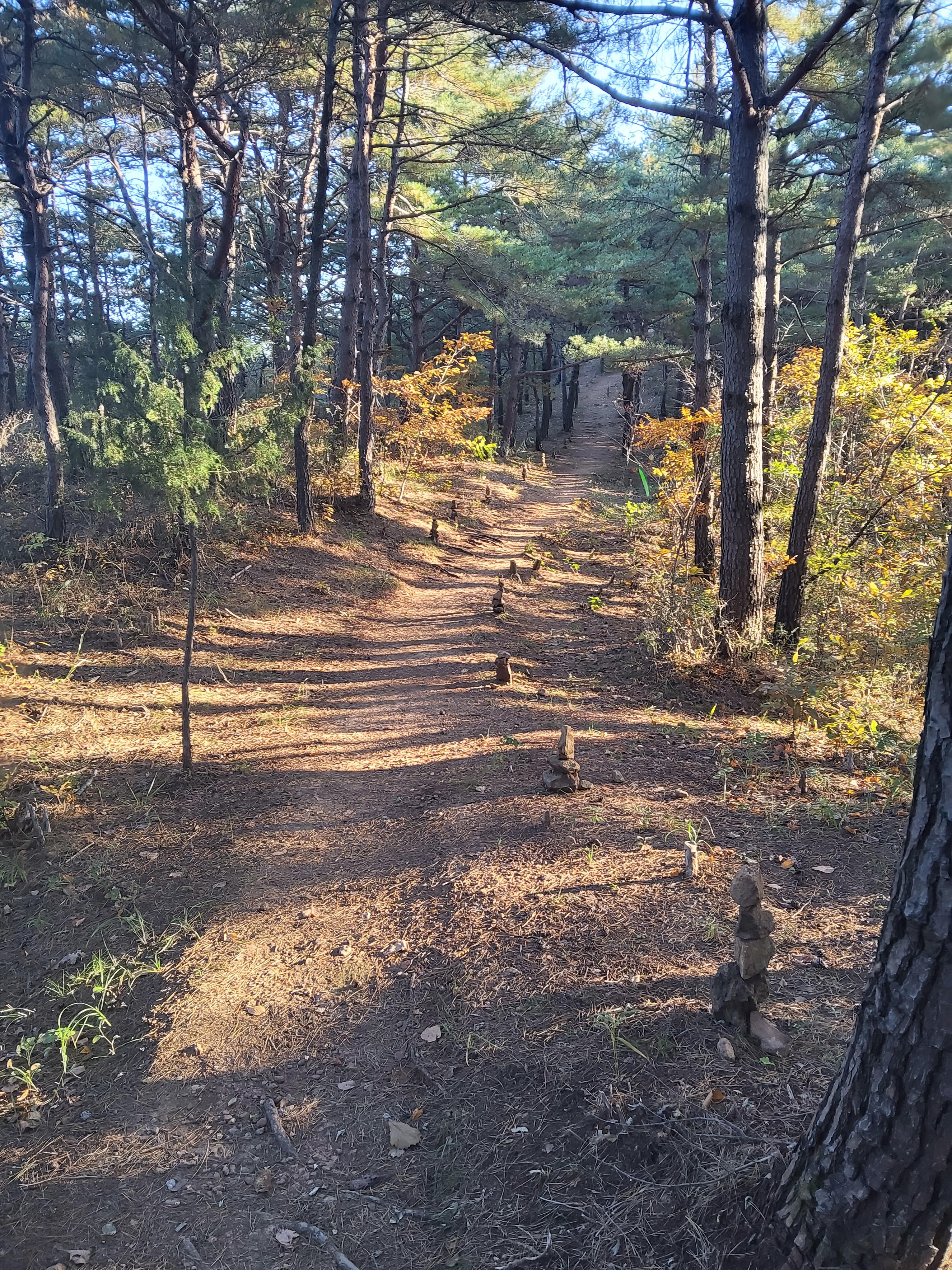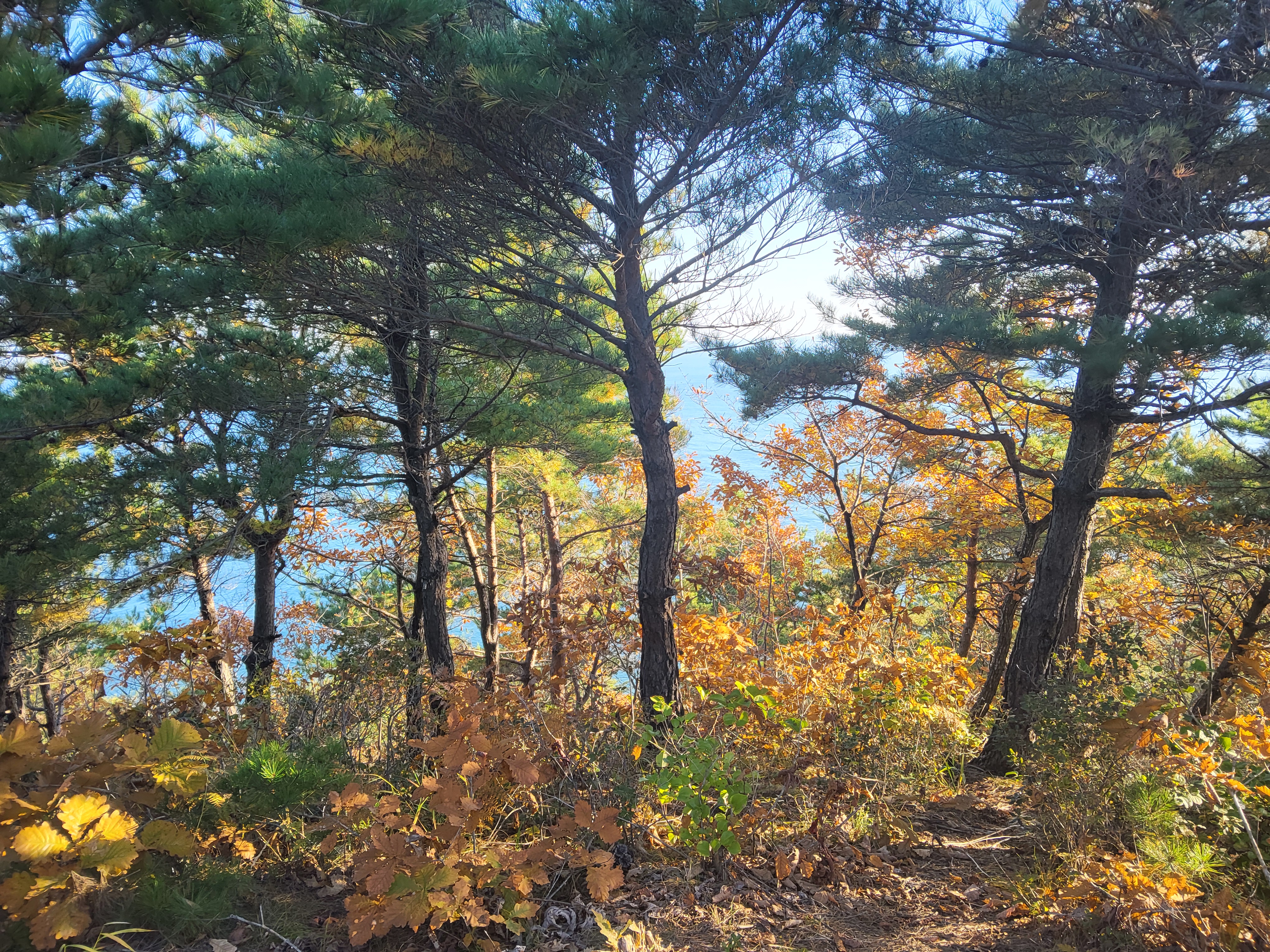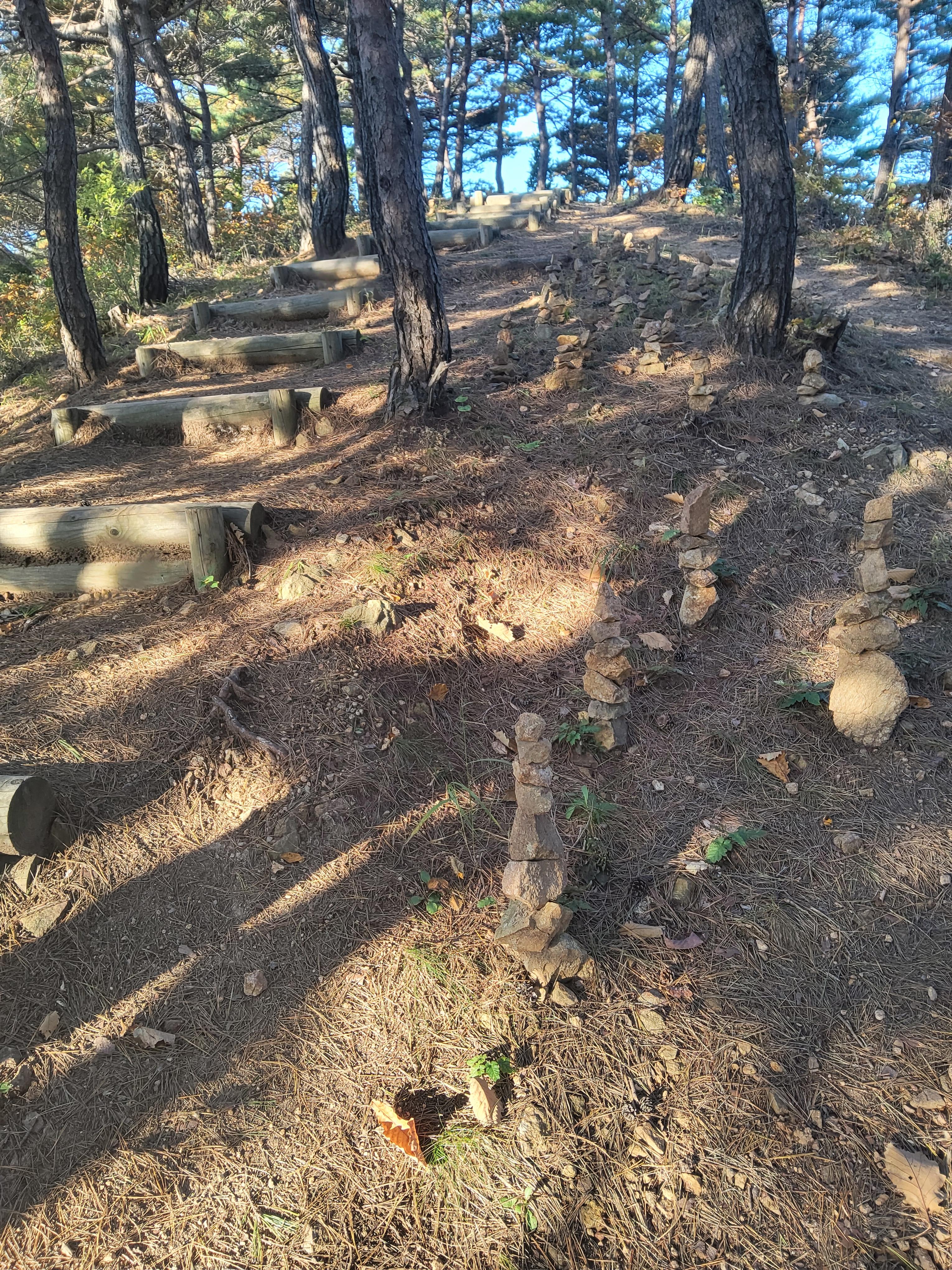 33-1코스 출발점에서 바로 언덕으로 올라가면 거진해맞이공원이 나온다. 거진해맞이공원에서는 거진항이 일망무제로 보인다. 해맞이공원을 지나서 산길을 따라가면 다양한 조각이 산길에 서 있고, 화진포 소나무숲 산림욕장의 소나무들이 하늘로 쭉 뻗어 올라 위용을 자랑하며 뽐내는 숲 사이로 난 길을 호젓하게 걸어가면 응봉에 도착했다.