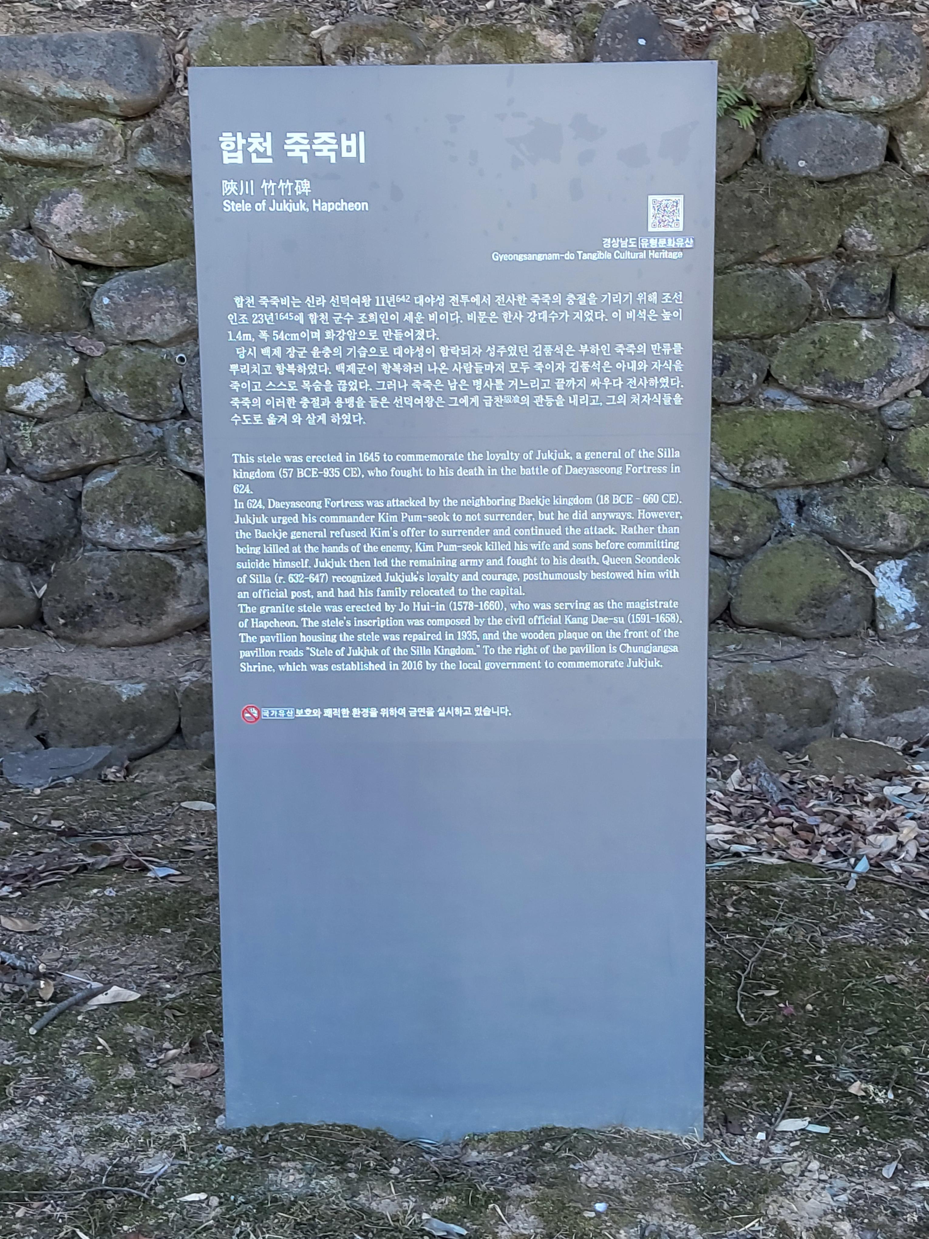 현재 대야성 동쪽에는 죽죽 장군의 충절을 기리는 ‘신라충신죽죽비(新羅忠臣竹竹碑)’가 세워져 있다. 그리고 합천에서는 매년 9월이 되면 신라 죽죽 장군의 충절과 용맹을 기리고, 합천 군민의 화합과 결속을 다지는 ‘대야 문화제’가 열린다.