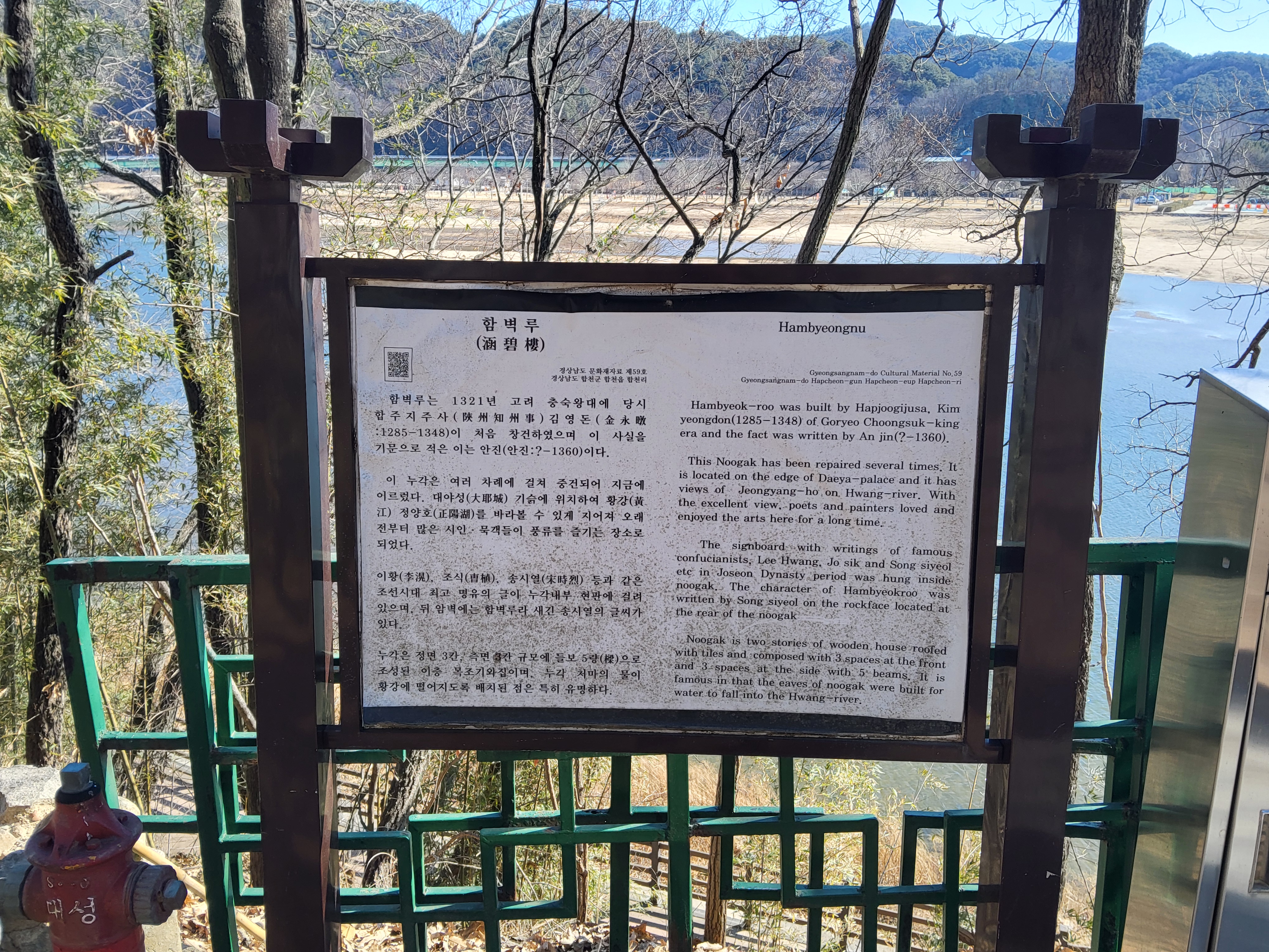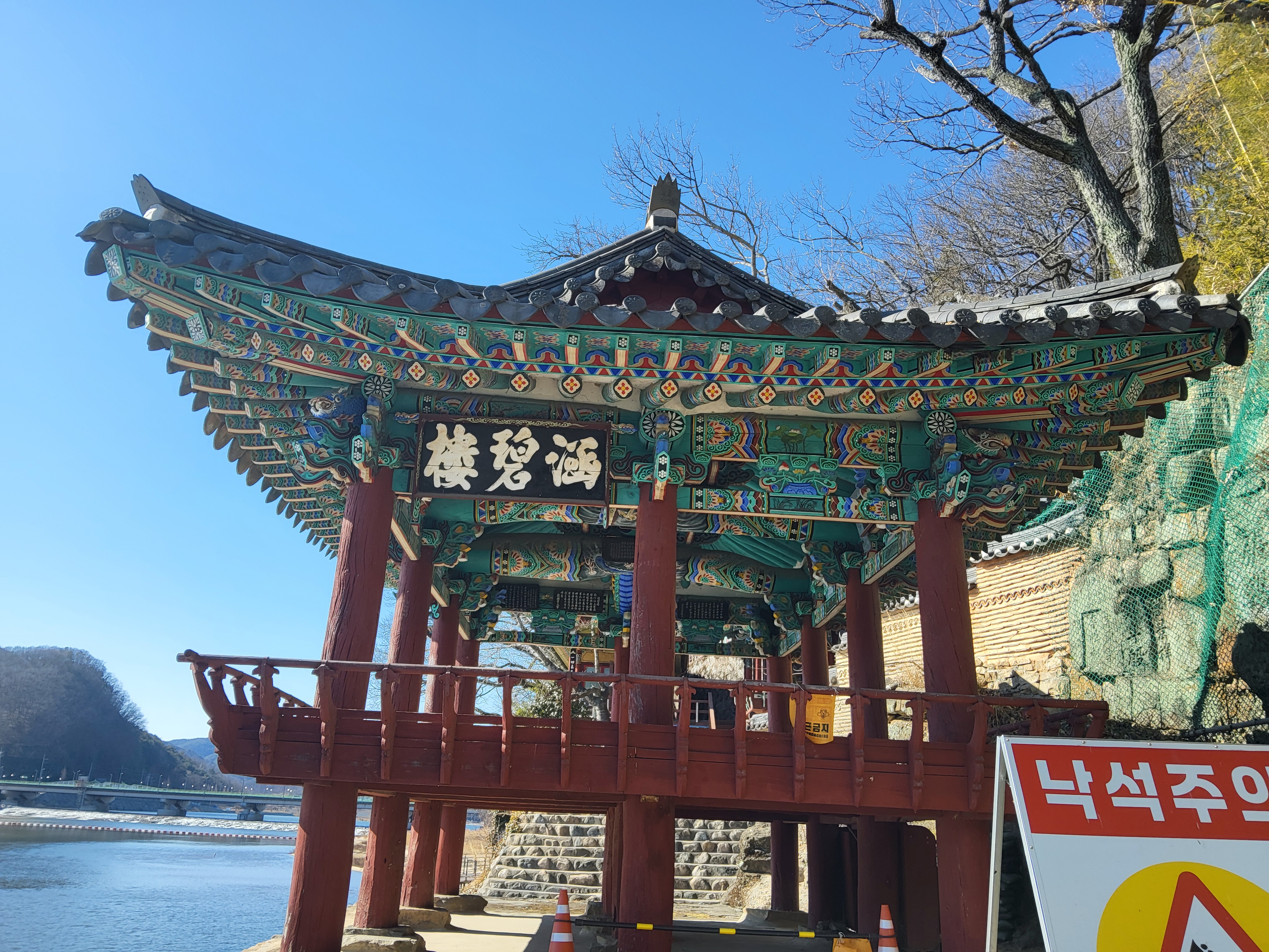 길을 따라 조급 가니 왼쪽에 도도하게 흐르는 황강가에 함벽루로 가는 이정표가 보인다. 이정표를 따라 강가로 조금 내려가면 함벽루가 나타난다.