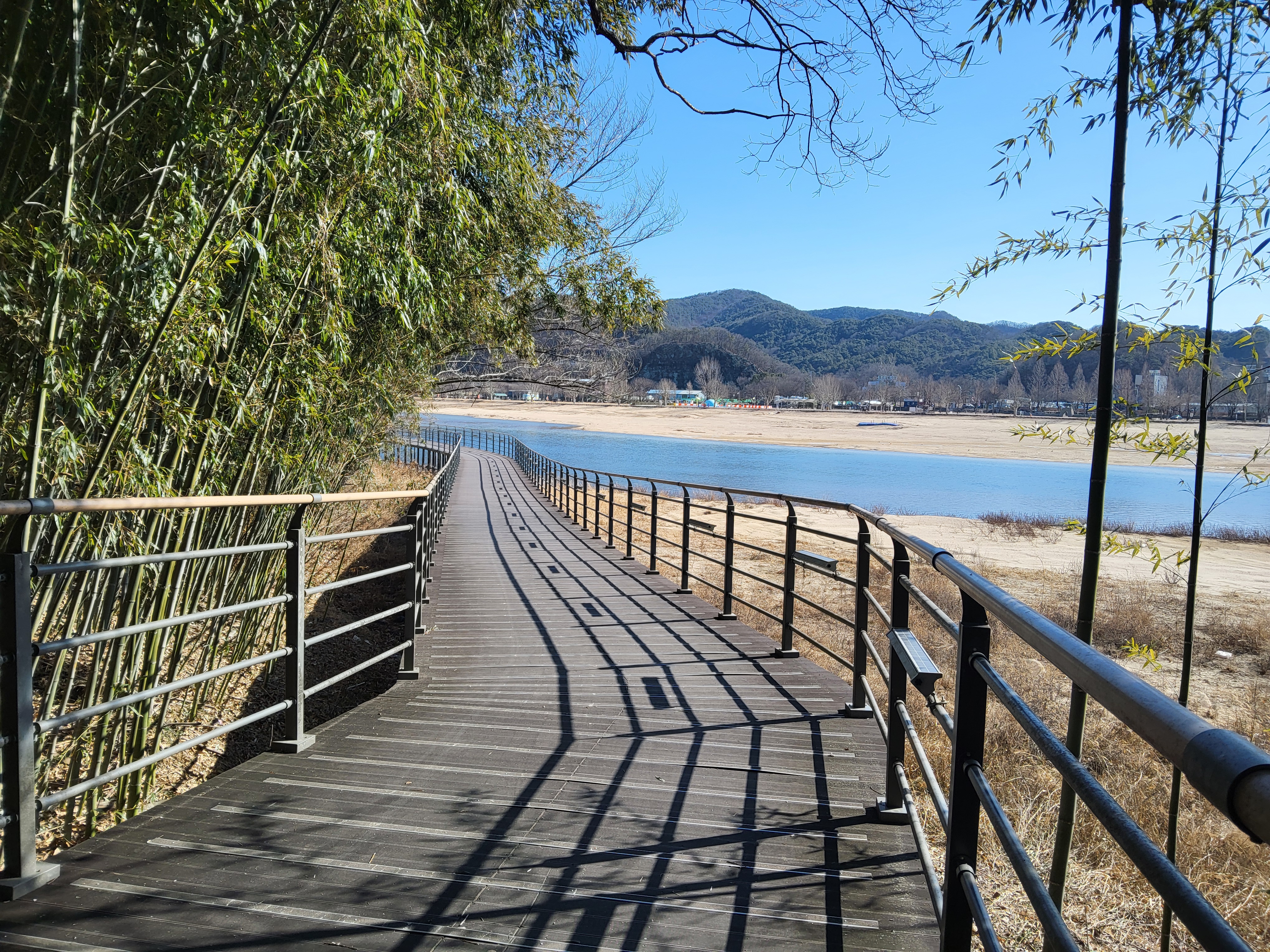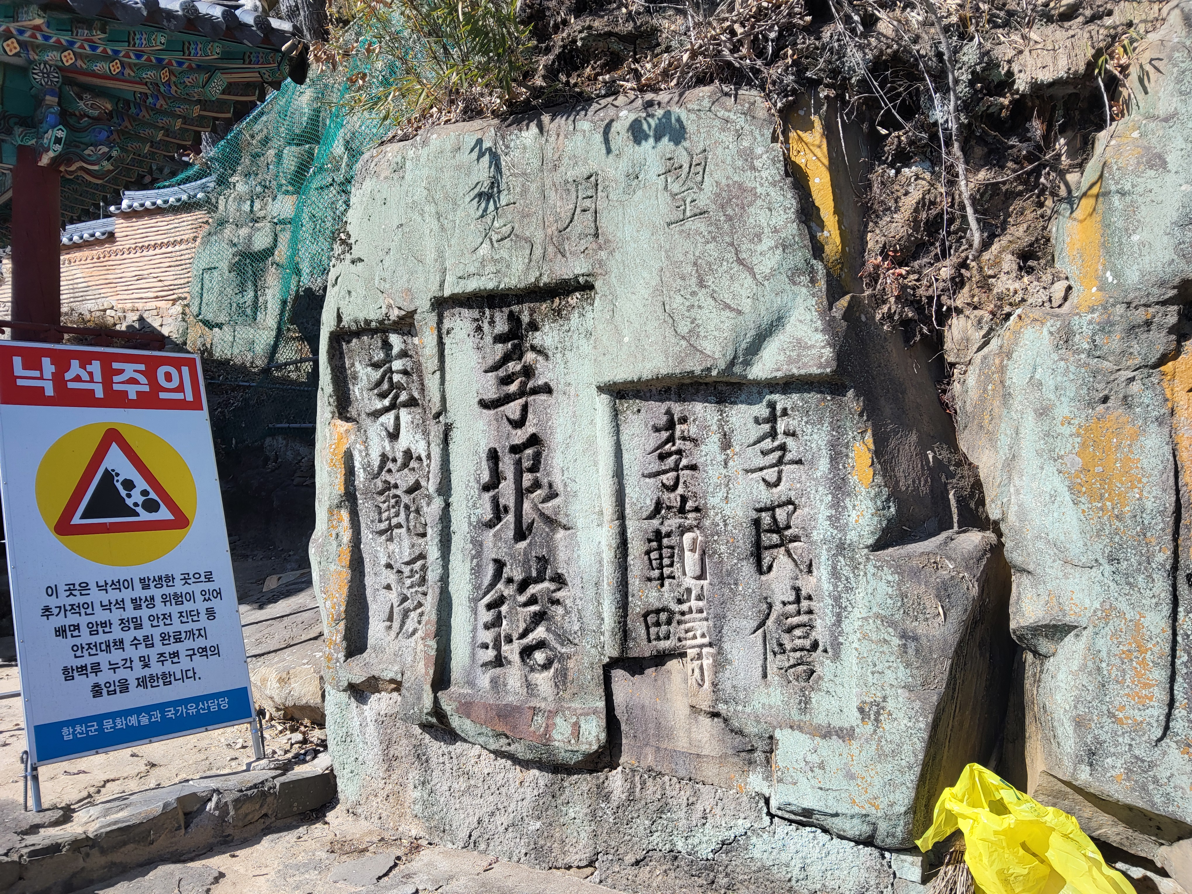 함벽루 앞에 나무 테크를 설치해서 사람들이 황강을 보면서 걷는 길을 만들어 놓았다. 그 길을 따라 걸으면 합천 댐으로 인해 물이 많이 줄었다고 하지만 앞에는 황강이 도도히 흐르고 강안을 보면 높은 단애가 자리잡아 천혜의 요새지가 되고 있음을 알 수 있다, 암벽위에는 대나무가 빽빽하게 자라고 있는 모습도 보인다.