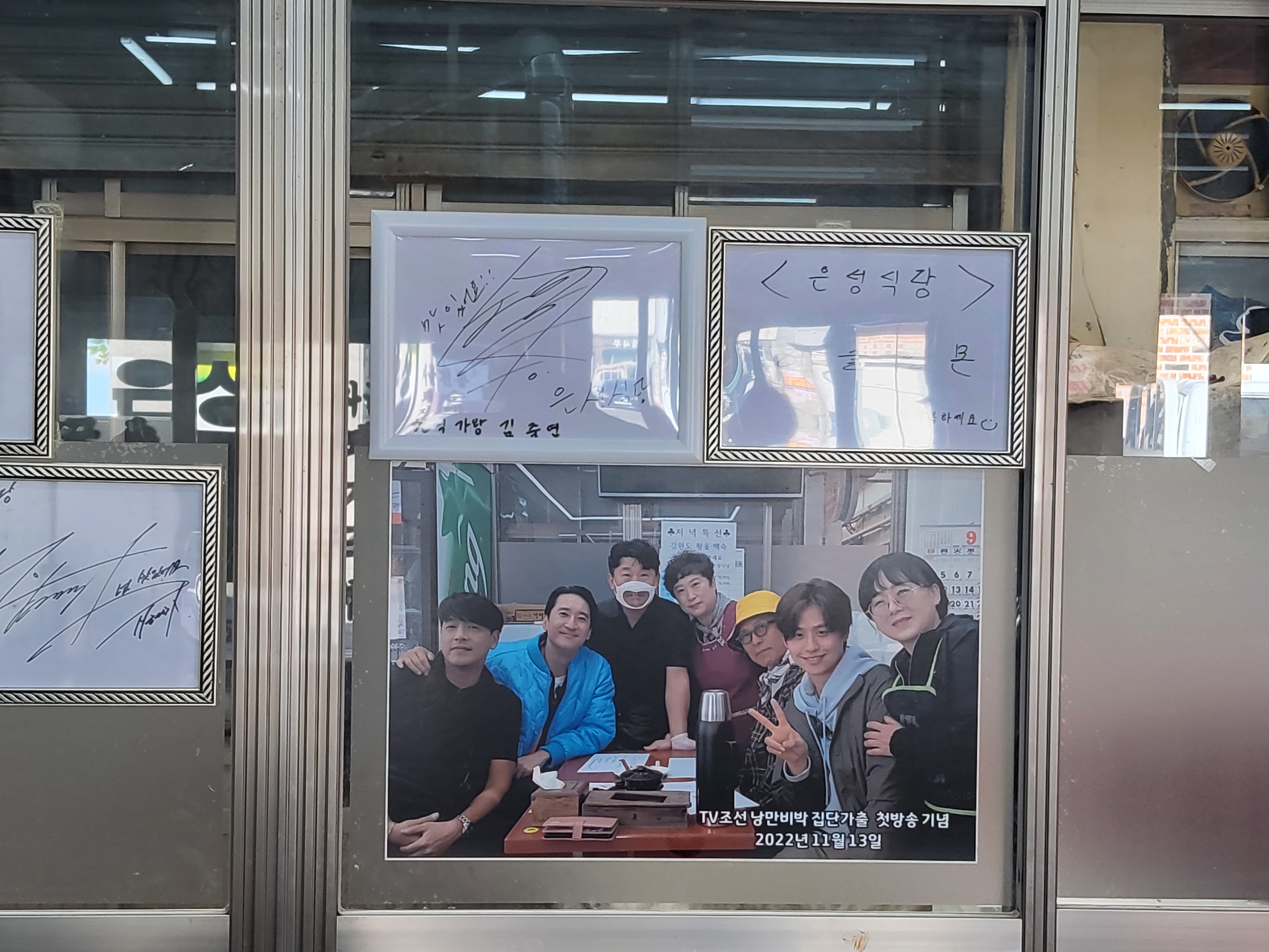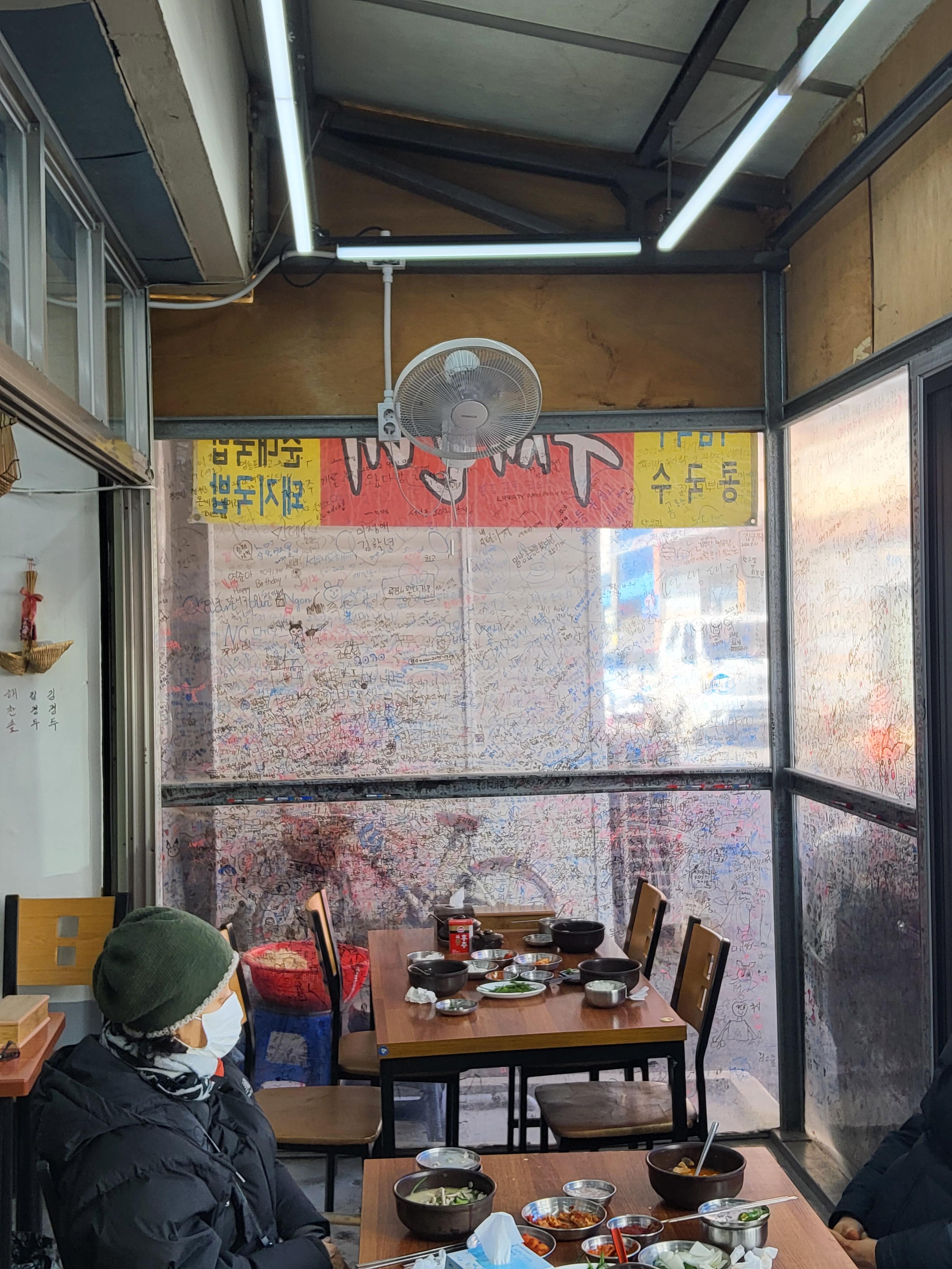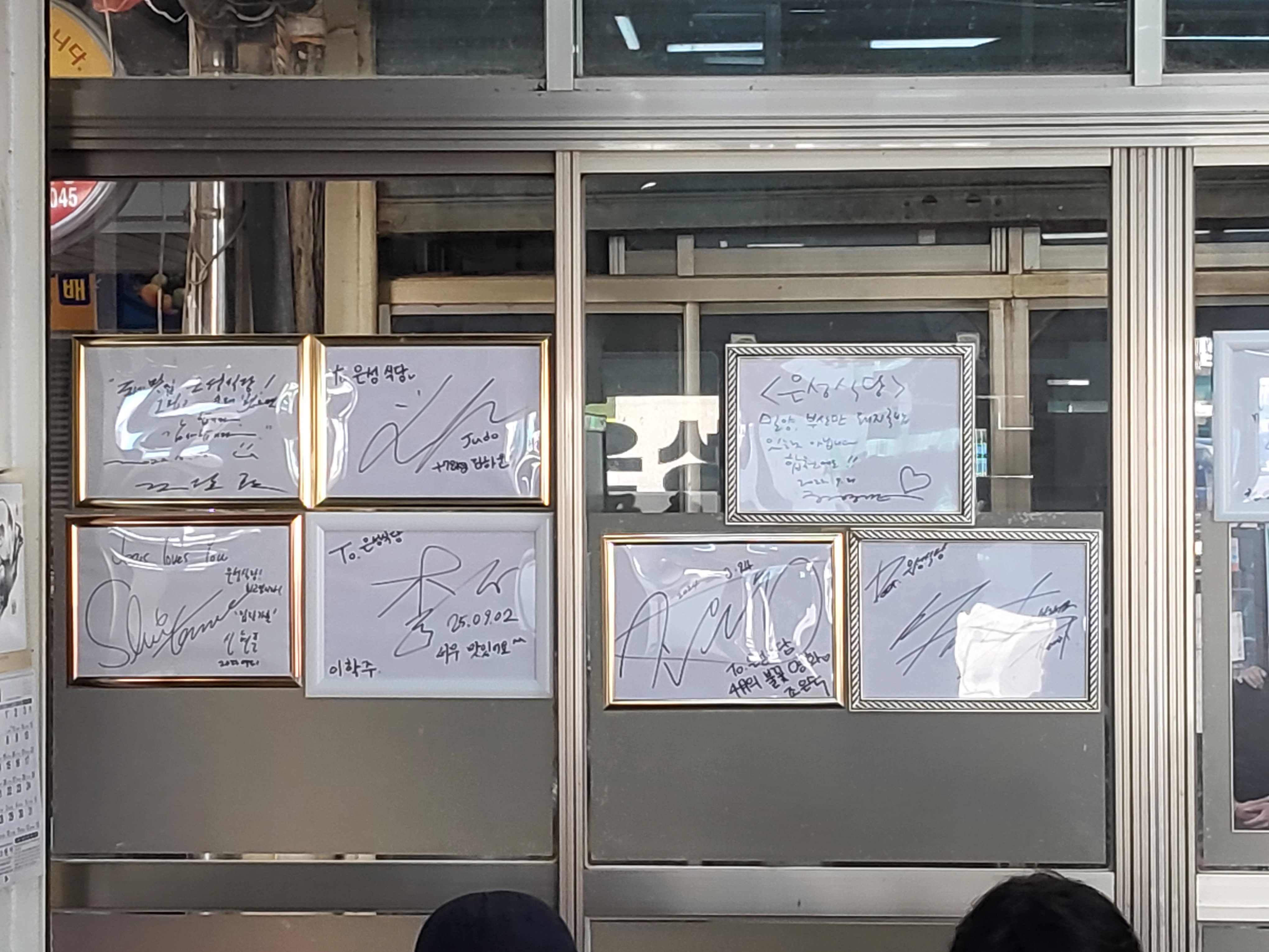 이 식당을 방문한 사람들의 사인으로 가득찬 벽