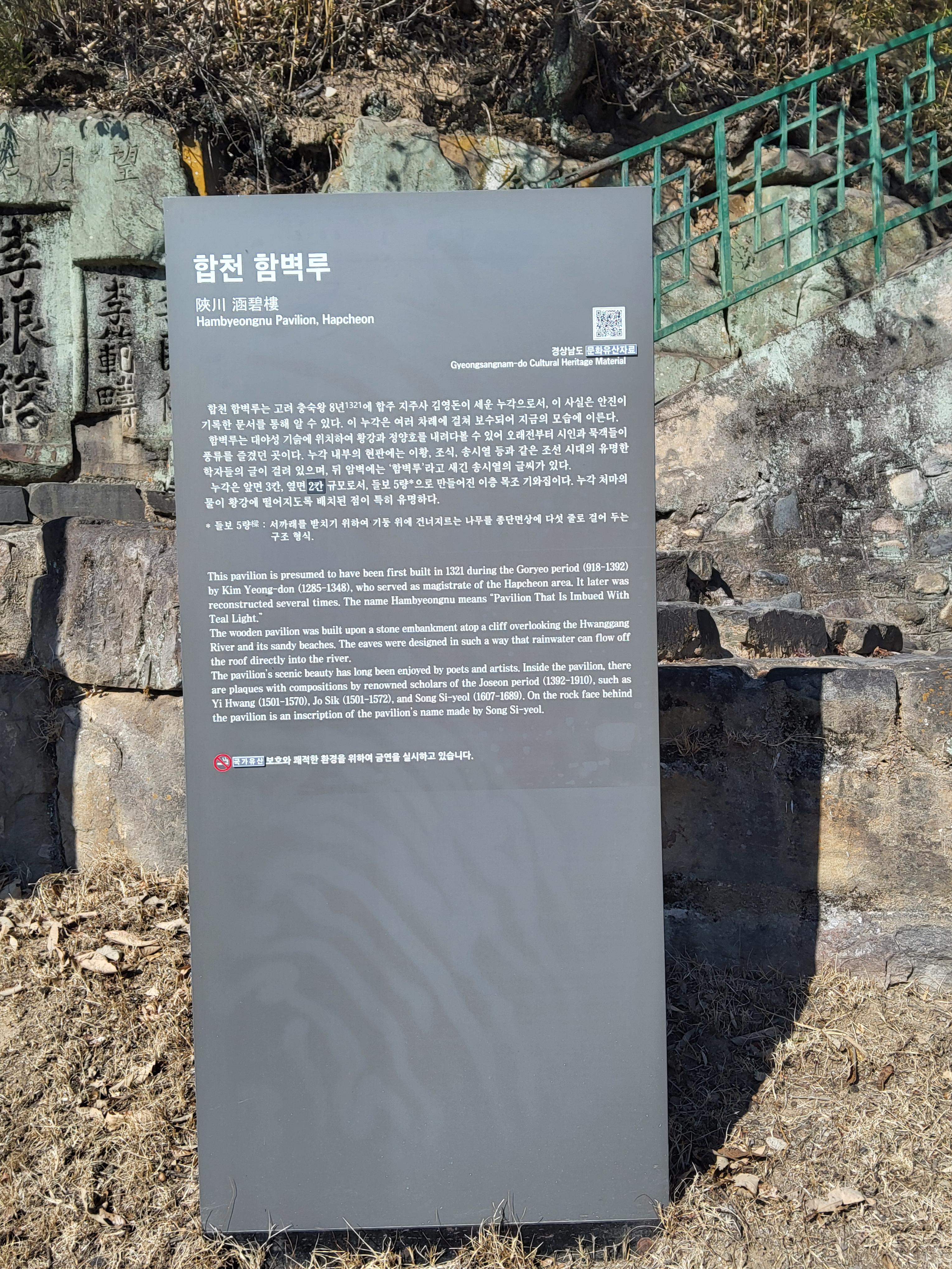 함벽루는 옛 선비들이 풍류를 즐기던 곳이며 진주 촉석루나 밀양 영남루보다 더 오래된 정자로 누각 처마의 빗물이 황강으로 바로 떨어지게끔 지어져 누마루에 앉으면 배를 타고 있는 느낌마저 든다.